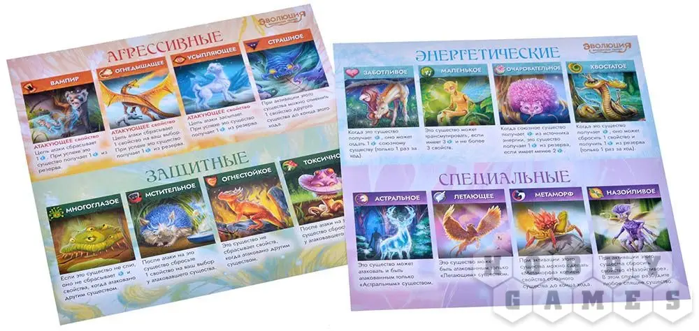 "Эволюция волшебных тварей" – это продолжение и переосмысление хитовой игры "Эволюция". Как и в оригинале, ваша задача – развивать своих существ, делая их всё более совершенными и добавляя им уникальные свойства. Каждый игрок управляет развитием конкретного волшебного существа, наделяя его способностями и изменяя по мере необходимости. В отличие от классической игры, здесь для победы не нужно набрать больше всех победных очков, а ваши существа не могут умереть – в определённый момент они трансмутируют, превращаясь в новые виды! Победит игрок, что первым трансмутирует существо трижды.