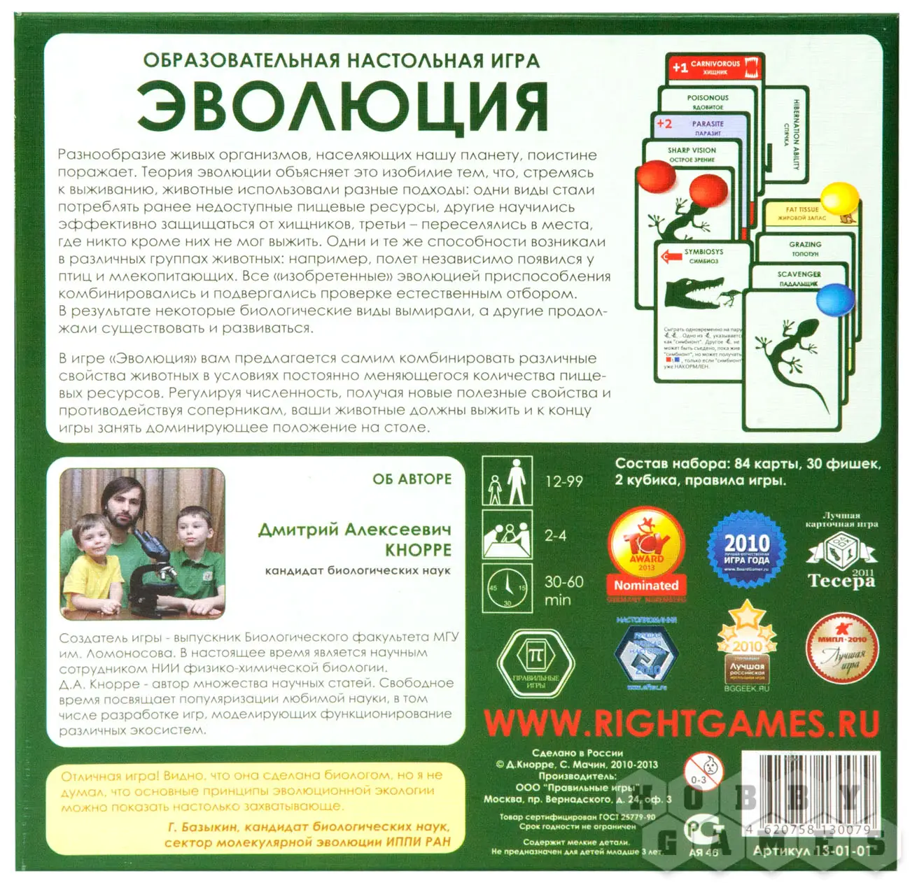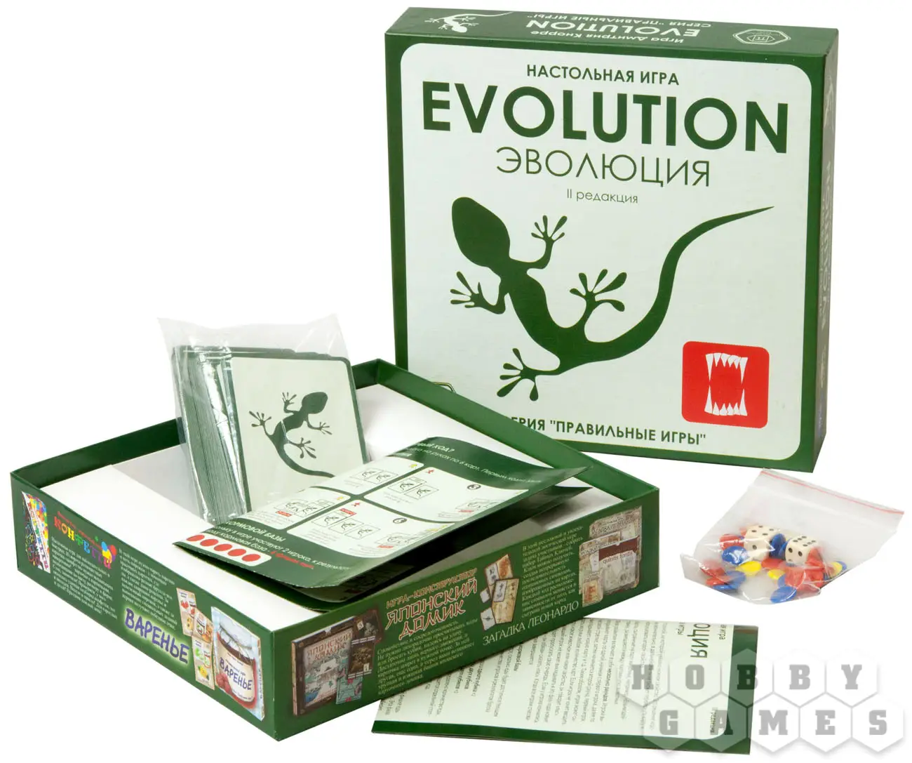 Настольная игра "Эволюция" – это уникальная игра о выживании и адаптации организмов для 2-4 человек, созданная кандидатом биологических наук Дмитрием Алексеевичем Кнорре. Она основана на реально существующих и функционирующих экосистемах и поможет вашему ребёнку в игровой форме понять такой сложный и длительный процесс, как эволюция, и даже поучаствовать в нём! Игра также будет интересна и взрослым, ведь вы сможете создать свою собственную ветвь эволюции и посмотреть, как живые существа приживутся и адаптируются в уже существующих условиях. Создавайте, эволюционируйте и развивайте!