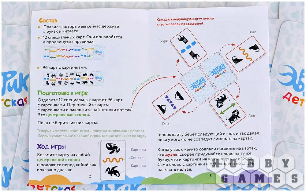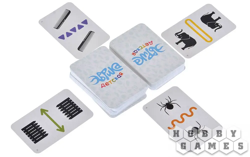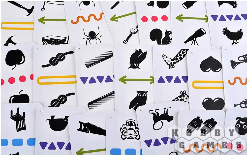 В центре игрового стола выкладываются две колоды карт. Игроки по очереди переворачивают верхнюю карту из стопки и быстро кладут рядом. В первую очередь нужно обратить внимание на цветные символы на картах. Если игрок видит такой же символ, как на своей карте, он смотрит на карту соперника, а точнее, на то, что там нарисовано. Допустим, на его карте нарисовано дерево. Значит, требуется назвать слово на букву "Д". А соперник, в свою очередь, видит, что на чужой карте нарисовано яблоко и вспоминает слово на букву "Я". Кто из двух игроков быстрее назвал правильное слово, тот и себе забирает карту соперника в качестве победного очка. После окончания колоды карты игроков подсчитываются и побеждает тот, кто набрал больше всех очков.