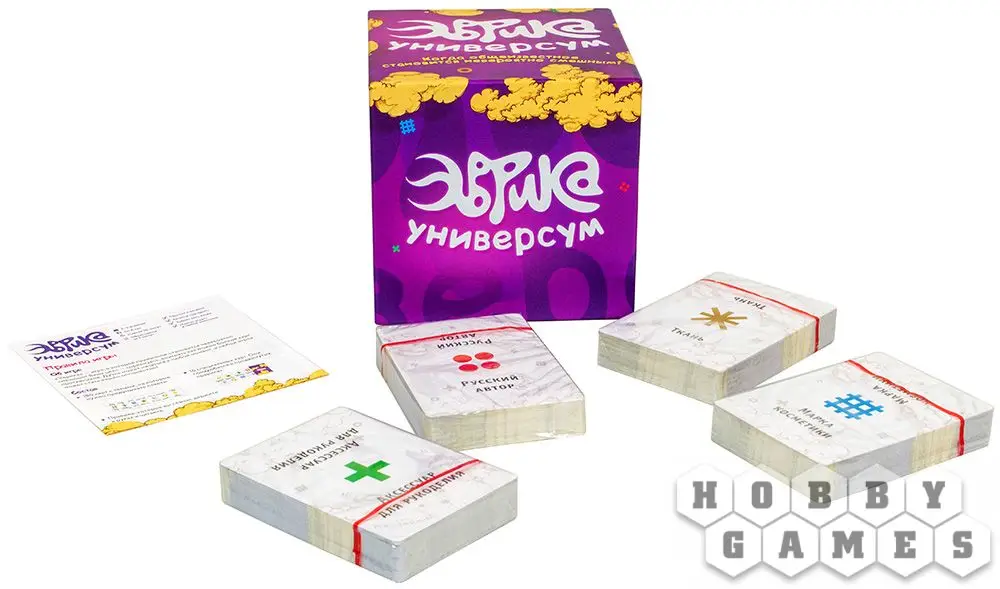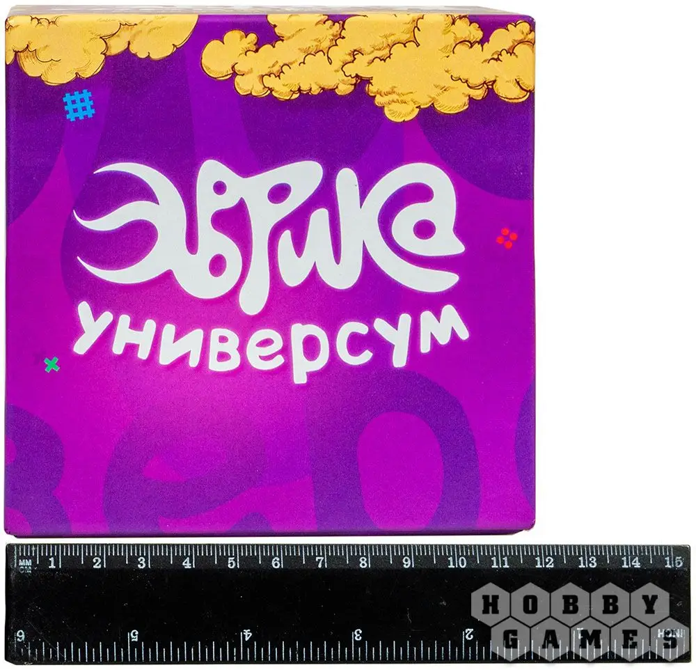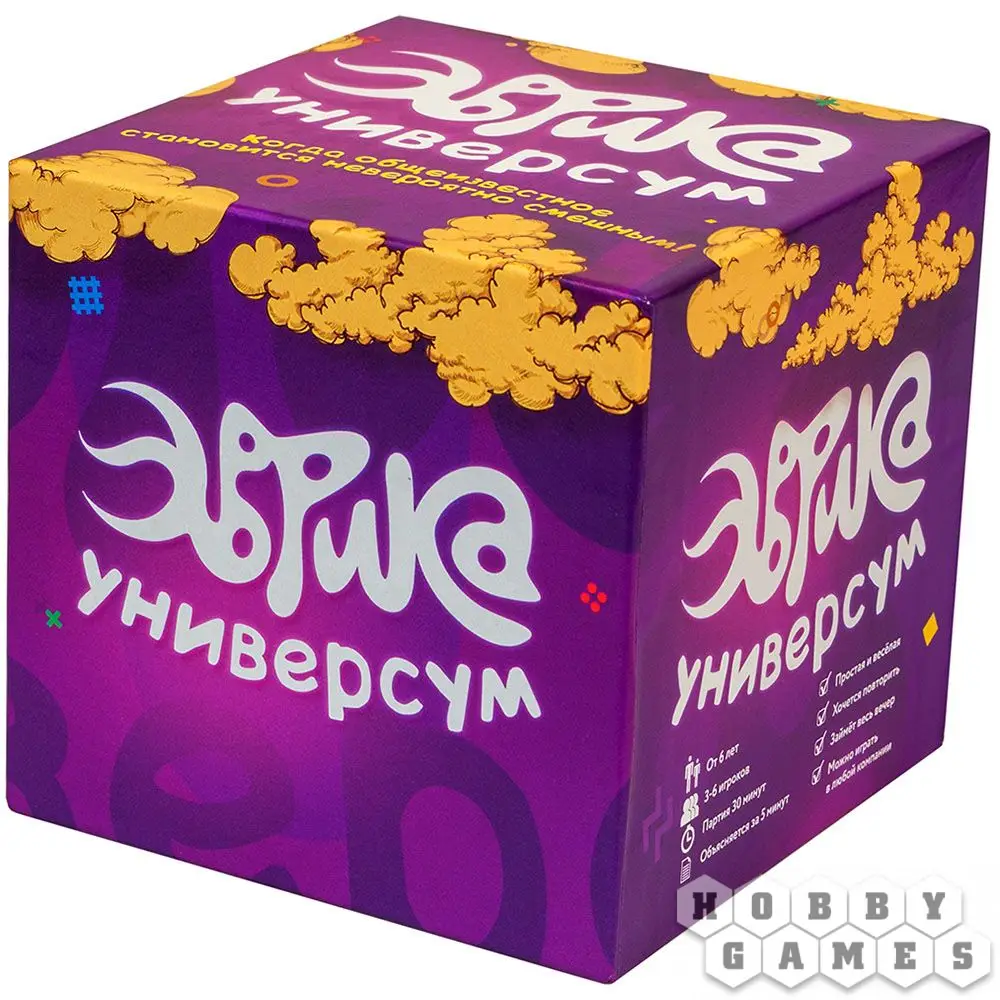 "Эврика Универсум" – настольная игра, в которой привычное становится невероятно смешным. Правила весьма простые: необходимо разделить колоду игровых карт на две стопки, после чего участники по очереди вытаскивают по одной карте и кладут на стол лицевой стороной вверх. Карты открываются до тех пор, пока не обнаружатся совпадения символов у двух игроков. Тогда каждый из них должен назвать слово, подходящее к определению на карточке соперника. Кто справился с этой задачей первым, тот забирает карту соперника себе и кладёт её в стопку своих победных очков. Также в колоде попадаются специальные карты, на каждой из которых изображено уже по два символа, что увеличивает шанс совпадений и уже не два, а больше игроков включаются в словесный поединок.