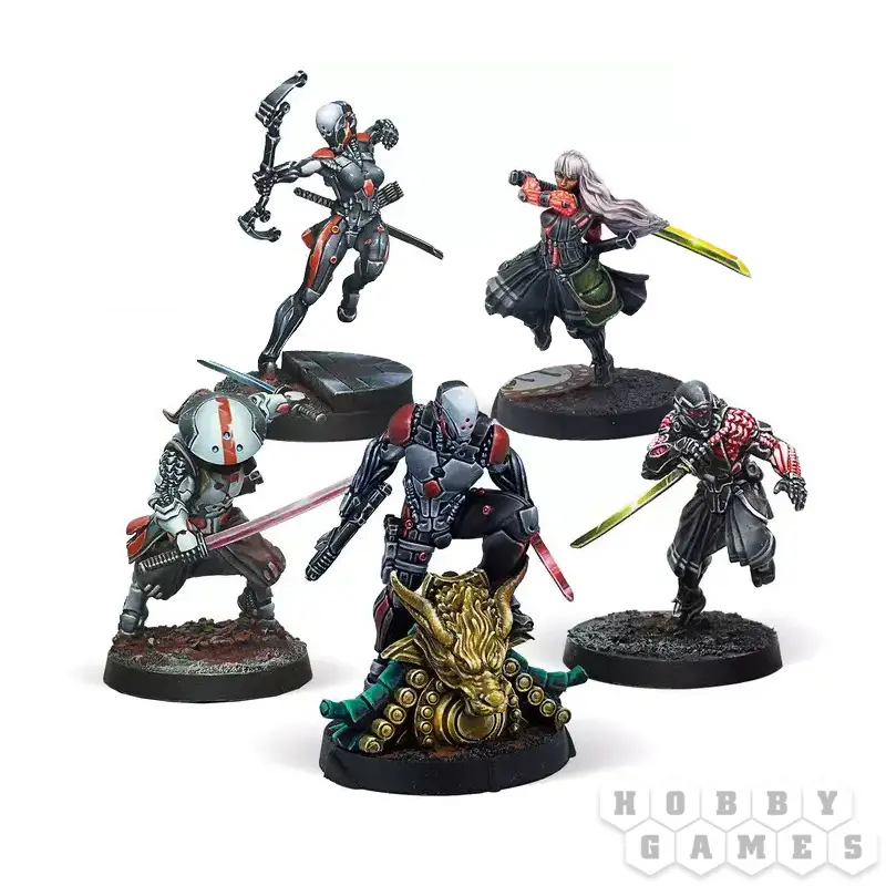 В данном наборе вас ждут 5 миниатюр: Ninja с Submachine Gun, Ninja с Tactical Bow, Shikami с Combi Rifle, Oniwaban в Monofilament CC Weapon, а также Shinobu Kitsune, вооружённый Monofilament CC Weapon. Фигурки Shinobu Kitsune поставляется с дополнительной шляпой, а Shikami можно надеть на голову шлем. Воистину, в списке никогда не бывает достаточно ниндзя!