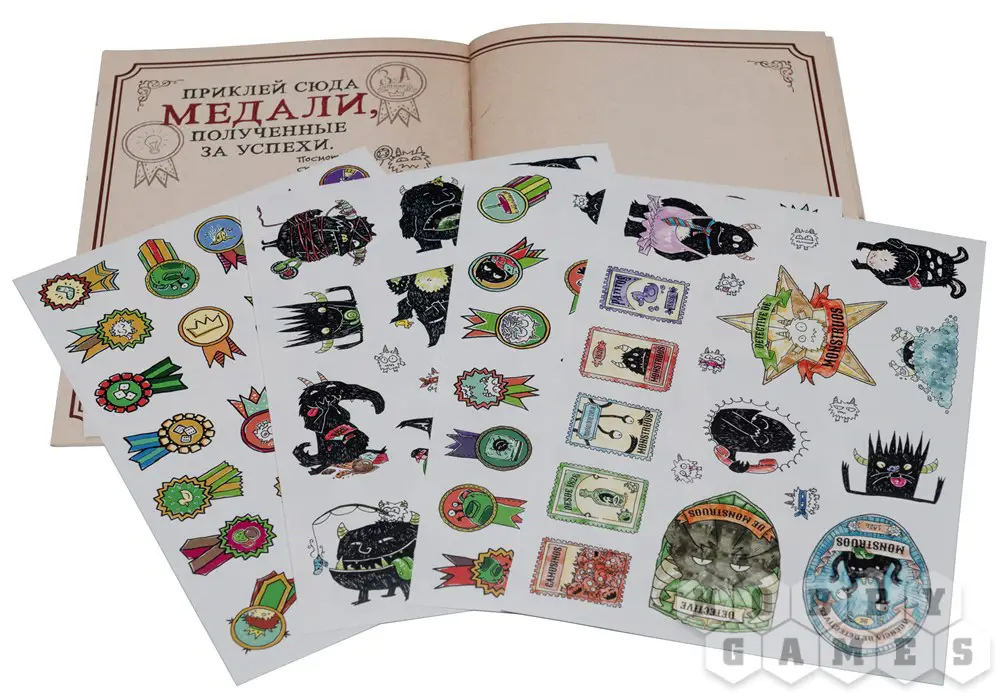 Перед вами – специальная полевая тетрадь юного сыщика. Если вы всегда мечтали работать в Агентстве и наконец-то туда попали, эта вещь вам очень пригодится! Сюда можно записывать свои достижения: каких монстров обнаружил владелец тетради, какие дела распутал и сколько сделал других важных и полезных вещей. Кстати, в тетрадь вложено несколько листов с наклейками монстров и медалей. Используйте их с умом, чтобы все знали, какие вы эффективные детективы!