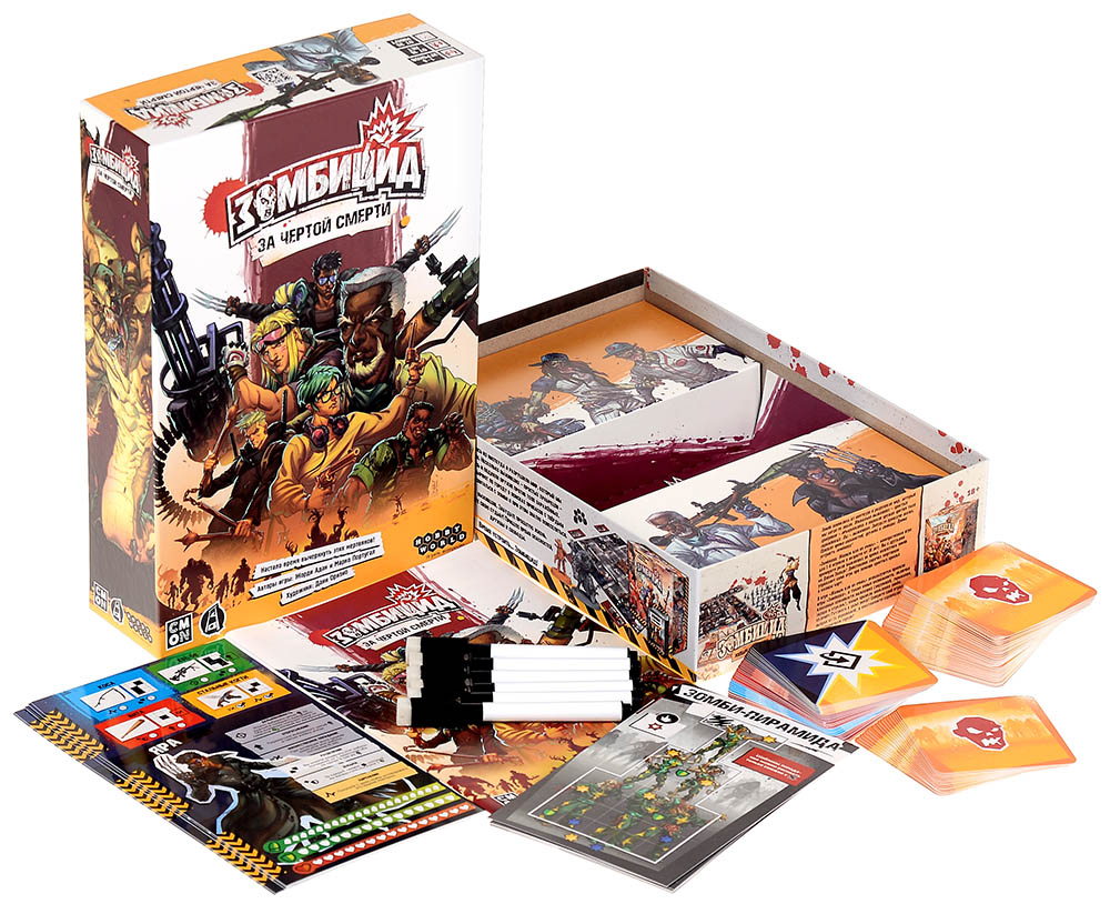 Один из самых необычных концептов: боритесь с ордами зомби, заштриховывая их маркером на карточках! Ваша цель – продержаться до конца, используя тактическое планирование и стратегический подход – можно свой собственный, а можно коллективный, если готовы разделить тяжбы выживания с друзьями (в сумме до 6 человек восемнадцати лет и старше). И не забывайте улучшать снаряжение – в конце ждёт встреча с главным боссом! Партия длится около получаса, зато приносит уйму впечатлений.
