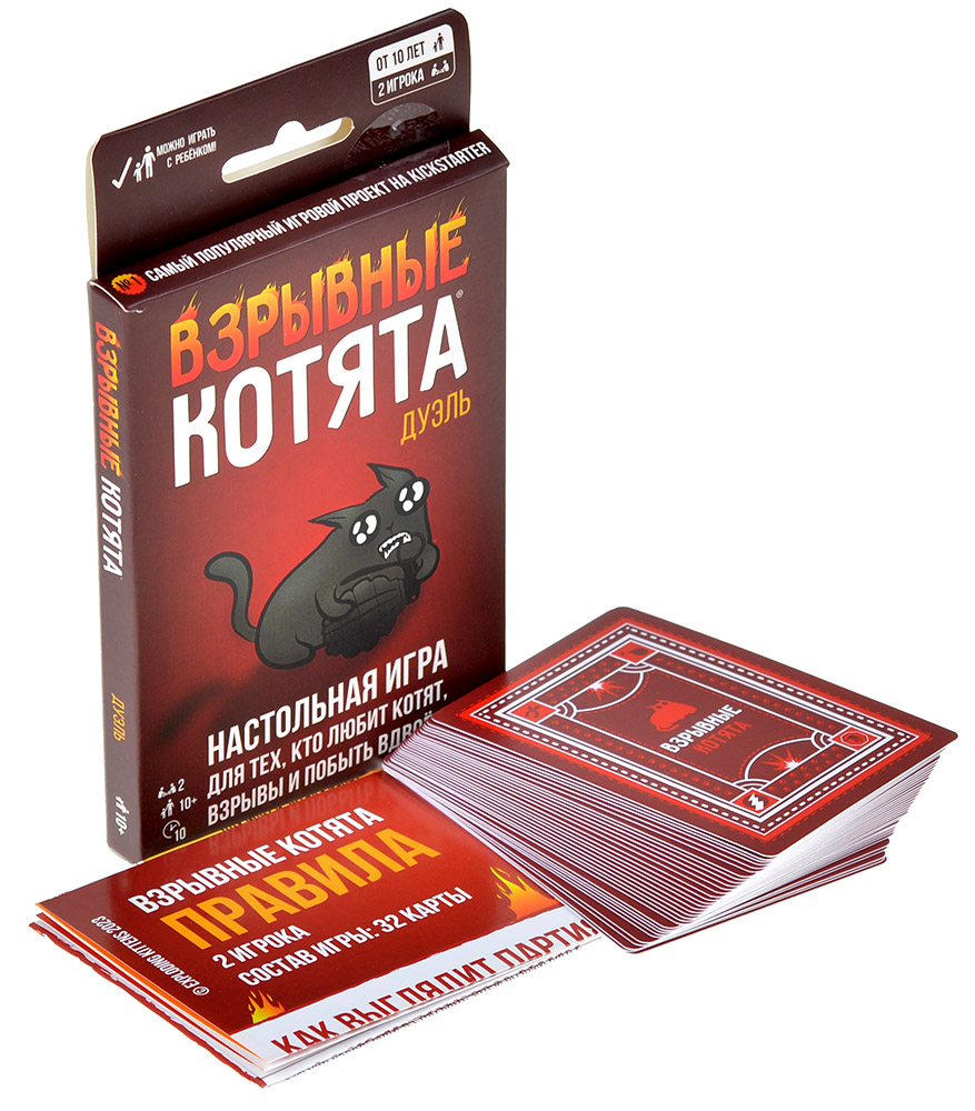 Сойдитесь в напряжённой дуэли с самым взрывоопасным оружием – пушистыми котятами! Это специальная версия легендарной серии, адаптированная под двух игроков. Тяните карты, избегайте взрывов и старайтесь подставить противника. Быстрая (всего 10 минут), азартная и очень смешная игра, которая легко развеселит любой вечер и в которую смогут сыграть даже дети, ведь возрастное ограничение здесь всего 10 лет.