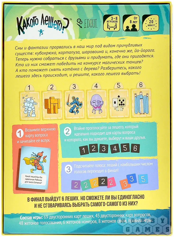 Правила максимально просты. Вы будете вытаскивать карту вопроса и зачитывать её вслух, а затем, в тайне друг от друга, голосовать за одного из шести леших, выложенных на стол. Задача – выбрать, который из леших, по мнению игрока и по мнению большинства, лучше всего подходит для озвученной ситуации. Затем участники раскрывают свой выбор всем за столом, а леший, набравший абсолютное большинство голосов, проходит в финал. Имейте в виду, что засчитывается только абсолютное большинство! Это значит, что если при игре вшестером один леший наберёт 3 голоса, а остальные по одному, ни один леший не выйдет в финал. Ведь 3 – это всего лишь половина... В данном случае команда теряет один жетон связи! Это своего рода ваши "жизни", которые терять совсем не рекомендуется. Но если все игроки единогласно выберут одного лешего, в награду команда получит жетон связи!