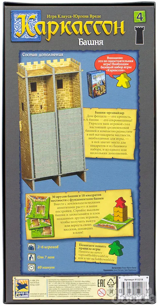 Какая же может быть крепость без высоченной башни, которую видно всем и каждому далеко в окрестностях? Естественно, без такой каменной красавицы не может обойтись и Каркассон, ведь каждому здесь известна истина о том, что дом феодала – его крепость... но вот сокровищницу надёжнее разместить в башне. Теперь и у вас будет возможность поместить на своём игровом столе средневековую башню в миниатюре. В ней можно уместить все необходимые квадраты местности, как из базовой игры, так и из одного или нескольких дополнений.