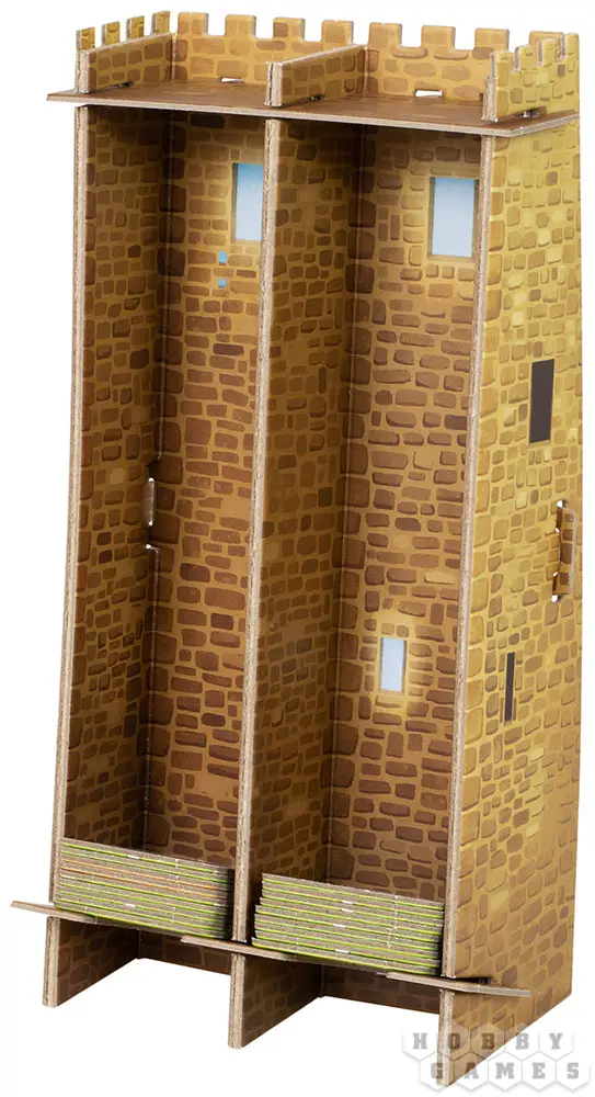 Перед первой игрой соберите башню-органайзер: сложите стены так, чтобы у вас получилась башня с двумя отделениями, и вставьте деталь без выемки в прорези в верхней части стен, а деталь с выемкой – в прорези в нижней части. После игры башню можно убирать в коробку, не разбирая, и использовать её как удобный органайзер.