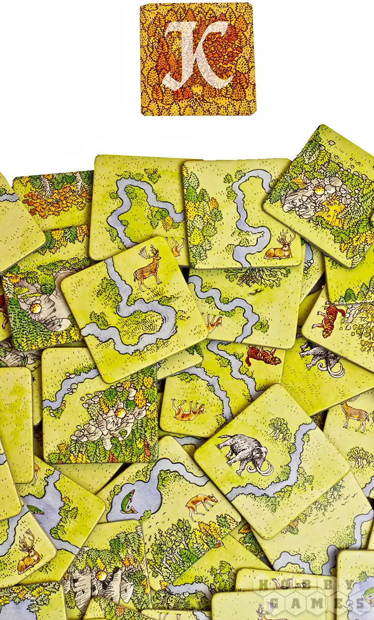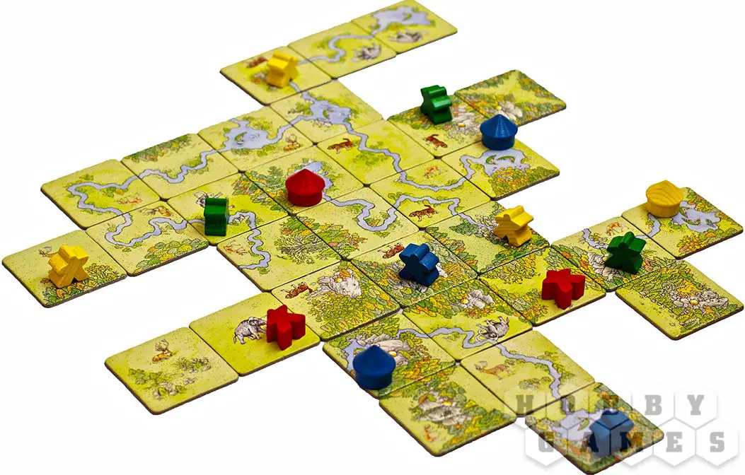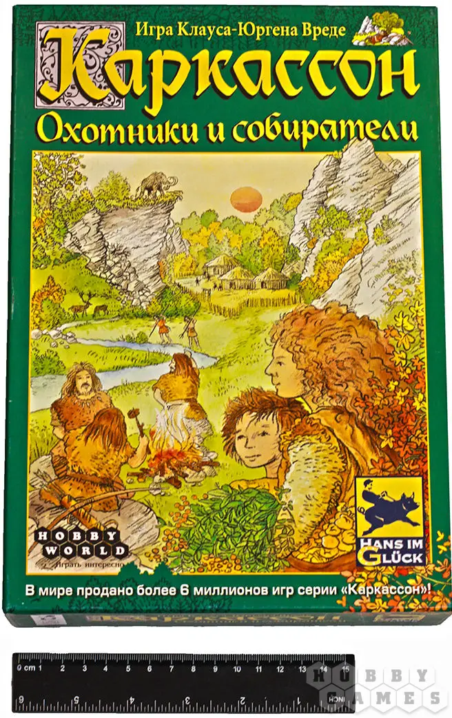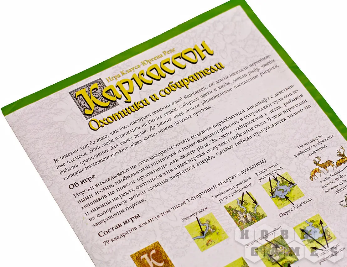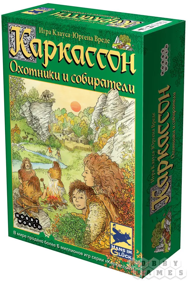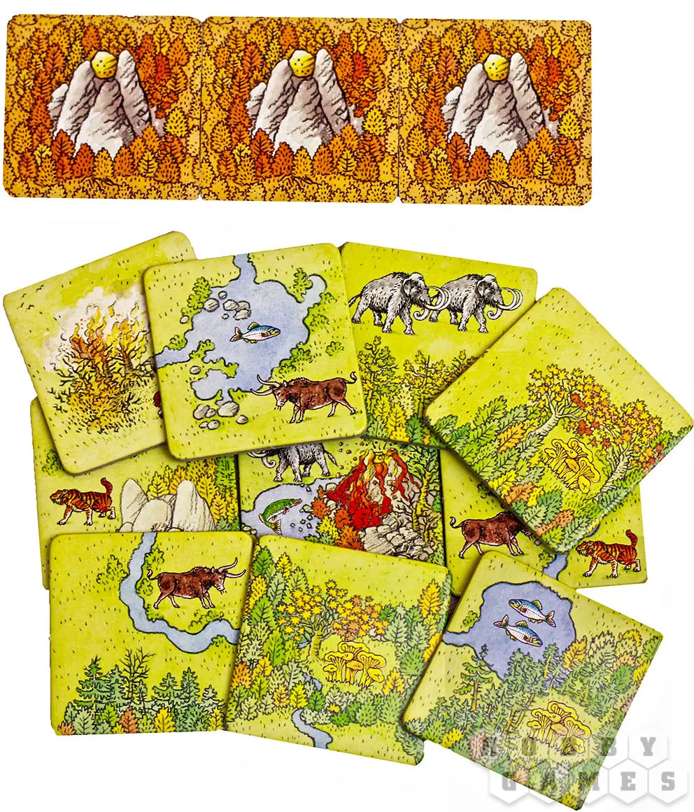 Главное отличие настольной игры «Каркассон Охотники и Собиратели», которое придётся многим по душе – это смена временной эпохи, что отлично сказывается на дизайне целой игры: яркие и сочные земли доисторических земель Каркассона призывают к освоению! В целом, игра несколько глубже и богаче, чем классический «К» без дополнений. Конечно же, поменялись объекты на карте и способы заработки очков, хотя бывалые игроки освоятся быстро – вместо дорог у нас есть реки с водоёмами, в которых водится рыба; вместо городов леса с золотыми жилами, а поля остались полями, да только на них полно дичи… на которую охотитесь не только вы, но и дикие животные…