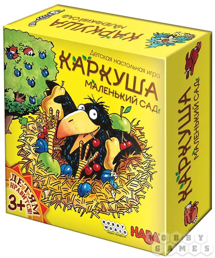 "Каркуша: маленький сад" – простая и милая игра для самых маленьких, в которой игроки собирают плоды с деревьев. Проиграть в ней очень сложно! Каркуша забралась в сад и по пути к себе в гнездо хочет урвать побольше сочных плодов. Задача игроков – опередить Каркушу! Всё, что требуется от игрока, это бросать кубик и проверять результат. Если выпадает один из цветов, то игрок собирает плоды соответствующего цвета. Если на кубике выпадает Каркуша, ворона прыгает на следующее дерево и срывает с него плод.