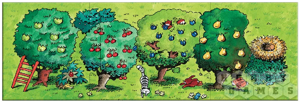 Игровое поле состоит из шести зон, по которым грозная Каркуша скачет по пути к своему гнезду. На поле есть четыре дерева с плодами различных цветов, это сливы, яблоки, груши и вишня.