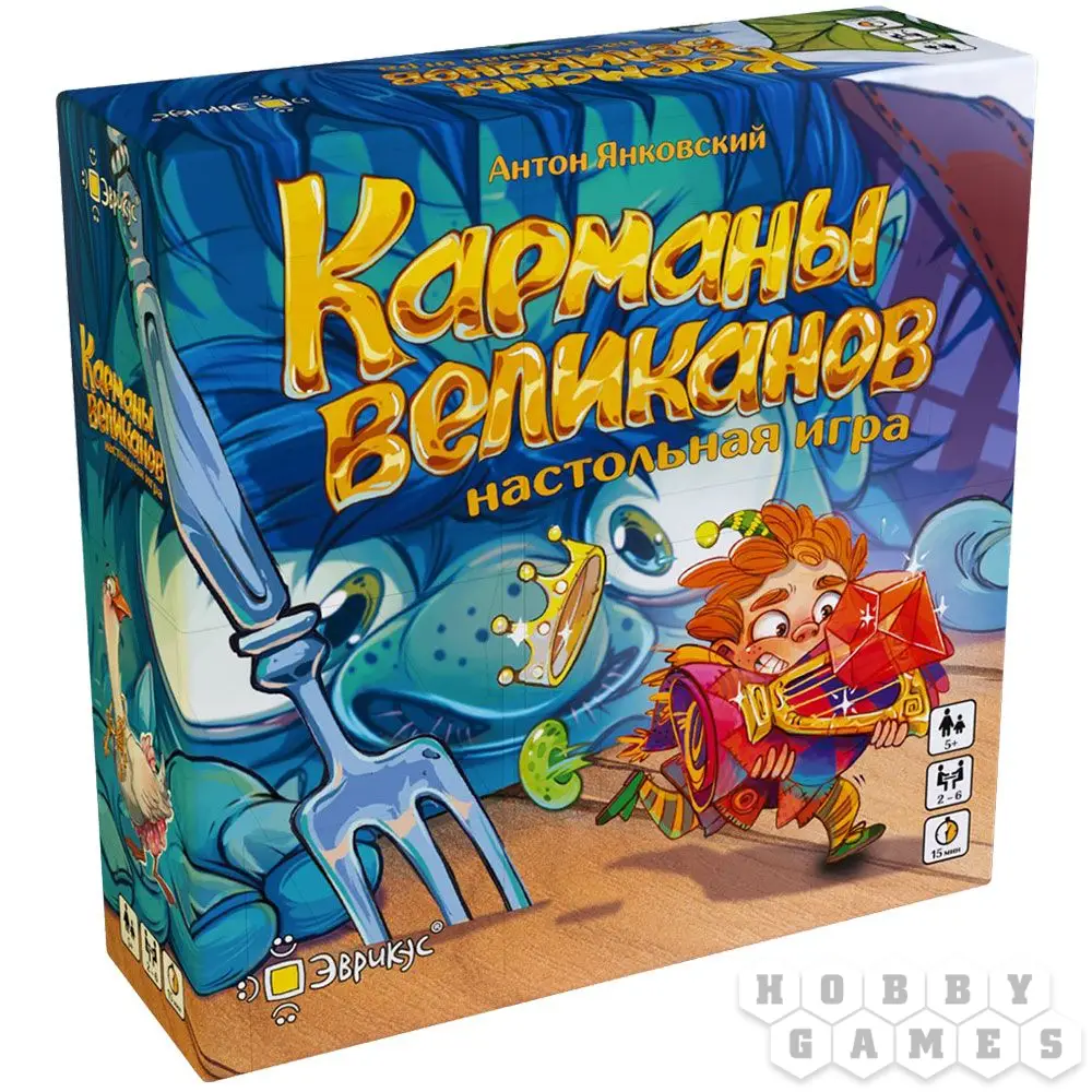 Карточная настольная игра "Карманы великанов" обеспечит весёлое времяпрепровождение за быстрыми партиями. Вы оказываетесь в стране великанов, теперь вам предстоит помочь им посчитать их богатства. Правила игры очень просты: перемешайте колоду карт и раздайте поровну всем игрокам. Смотреть их нельзя, положите перед собой рубашкой вверх. Далее одновременно со всеми игроками произнесите "Как у великана полные карманы...", и выложите в центр стола верхнюю карту своей колоды лицом вверх. А теперь самое время проверить, кто быстрее всех считает: на каждой карточке изображены несколько предметов, они могут повторяться. Нужно назвать предмет, который повторяется больше всего на открытых картах всех игроков. Кто первым правильно посчитал и назвал нужный предмет, побеждает в раунде и забирает себе все карточки. Игра продолжается, пока один из игроков не заберёт себе все сокровища. Но будьте очень внимательны при подсчёте: шумная Гусыня и Мистер Крыс могут нагрянуть в любой момент и кардинально поменять правила игры!