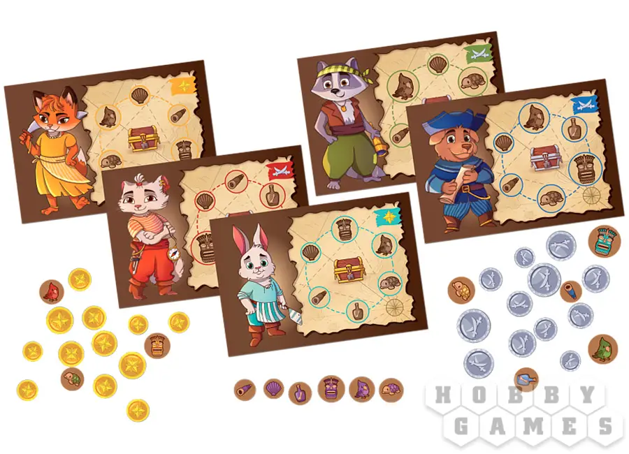 Каждый игрок выбирает планшет своего героя, он же по совместительству станет вашей картой сокровищ, на которой указаны нужные вам ориентиры. Переверните жетоны ориентиров лицевой стороной вниз и перемешайте их. Кар-р-рамба, самое время начинать поиски!