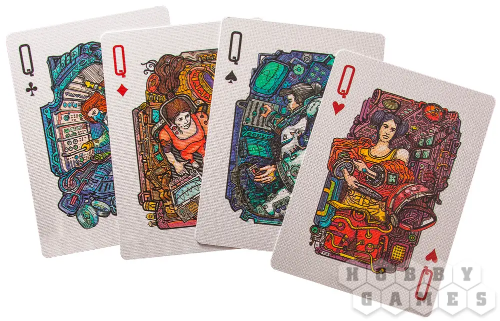 Дизайнерские колоды от "Картбюро Синкевича" предлагают новый взгляд на старый формат – персонажи и символы классической колоды рассмотрены через призму ретрофутуризма. Скафандры, звездолёты, далёкие планеты… Поклонники фантастов двадцатого века оценят! Знатоки жанра найдут в образах из колоды много знакомых элементов, начиная от “Тайны Третьей Планеты” и заканчивая “Чужим”. Ко всему прочему, данные карты отличаются поистине научно-фантастическим качеством и изностойкостью.