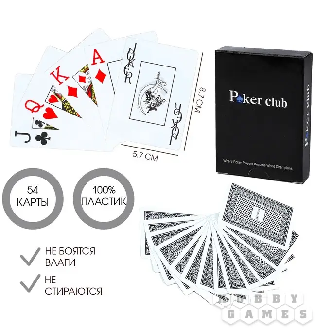 Карты игральные пластиковые "Poker club" толщиной 300 мкм с синей рубашкой изготовлены из 100% пластика. Благодаря гладкой стороне рубашки они обладают тактильной приятностью и легко скользят по поверхности игрового стола.