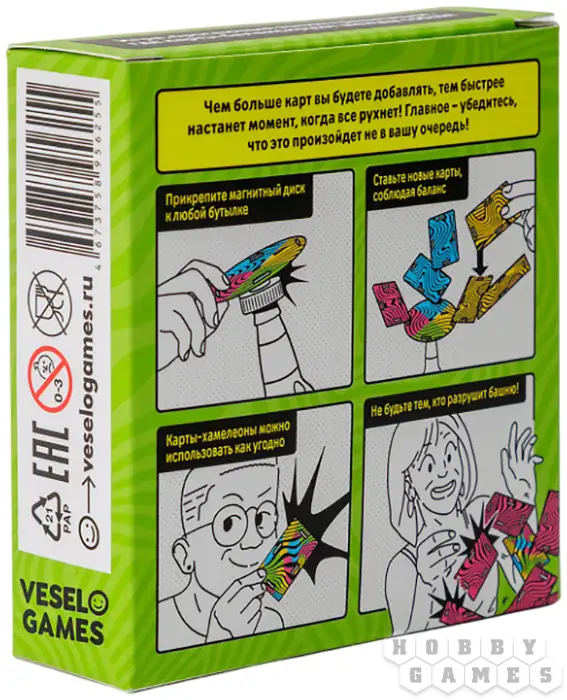 Игроки по очереди берут карту из колоды и аккуратно цепляют её к башне так, чтобы цвет карты совпал с цветом места крепления. С каждым ходом конструкция начинает раскачиваться, а азарт растёт вместе с высотой башни.