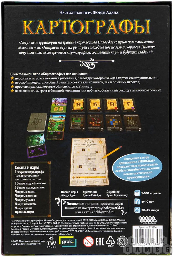 "Картографы" – семейная настольная игра, в которой можно отправиться навстречу приключениям хоть в одиночку, хоть огромной компанией! Целый год (условный, конечно же) игрокам предстоит путешествовать по королевским землям, старательно зарисовывать изученные окрестности в картографические планшеты, получать за свои старания золотые монеты из казны, а также почётные звёзды, в коллекционировании которых и заключается главная задача.