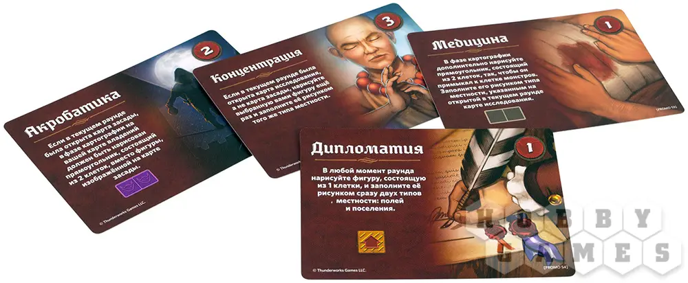 Также в коробке с игрой вы найдёте дополнение "Навыки", которое привносит разнообразие в процесс, добавляя восемь карт навыков. Их можно использовать, только потратив заработанные честным исследовательским трудом золотые монеты.