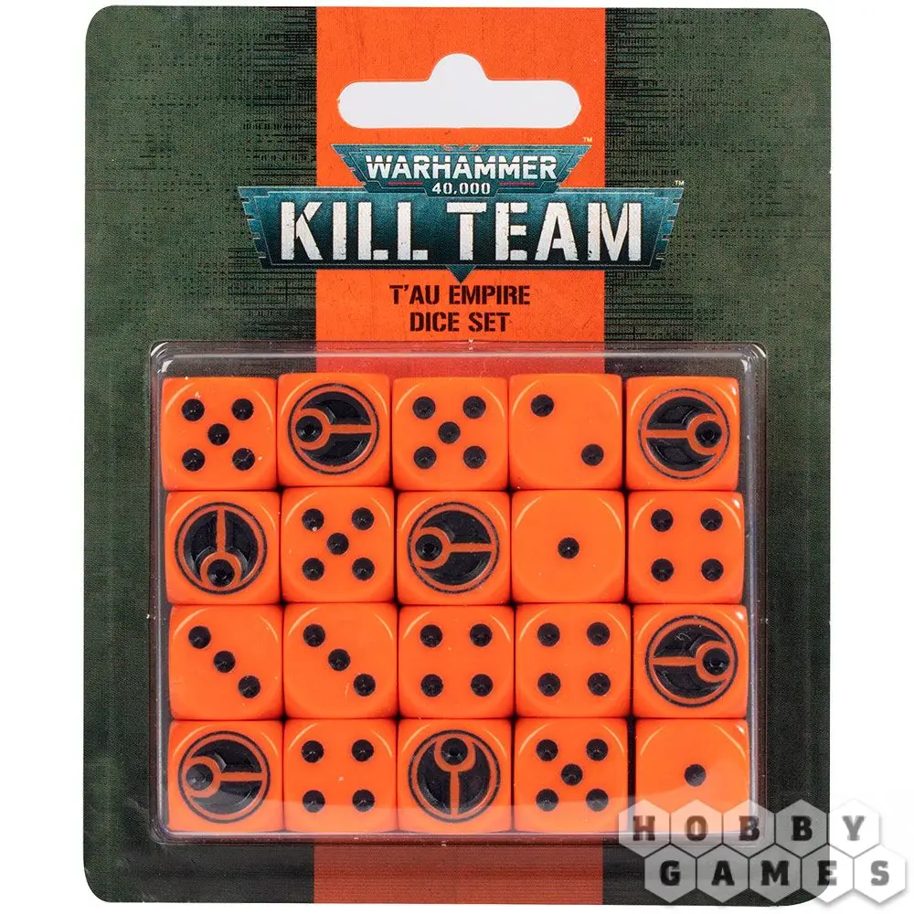 Комплект включает 20 оранжевых шестигранных кубиков размеров 16х16 мм. Символы на них, включая знак Т’ау на грани с шестёркой, выполнены чёрным цветом.