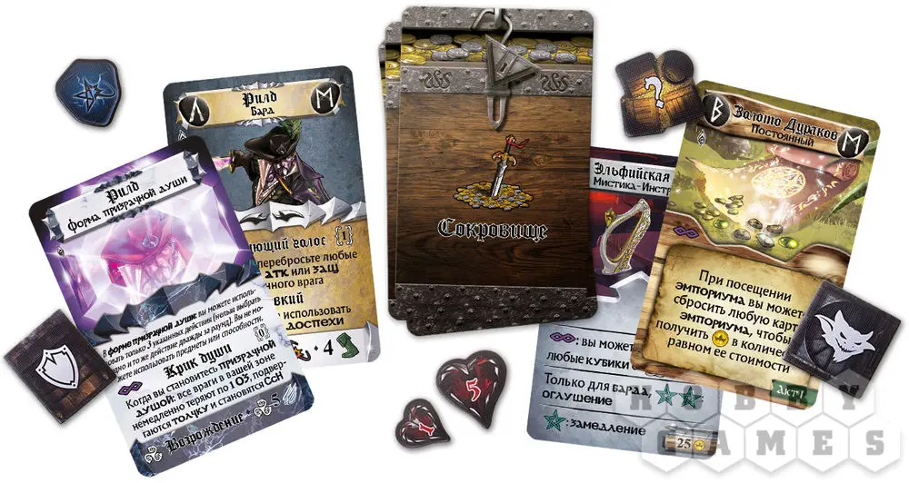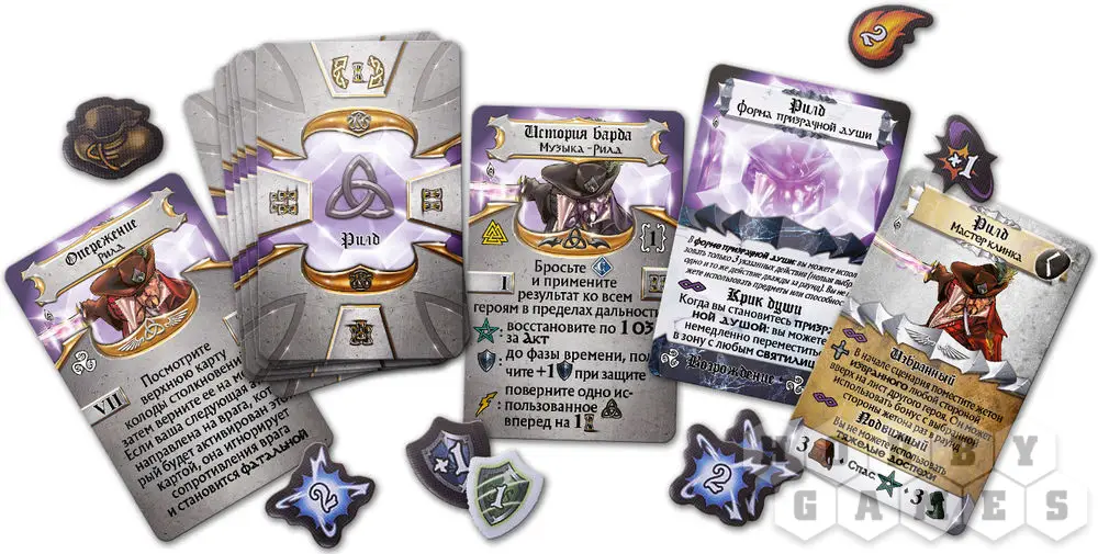 В каком бы воплощении Рилд ни оказался на вашем игровом столе, он всегда готов прийти на помощь товарищам в виде великолепной фигурки и колоды карт предметов и способностей, которые входят в комплектацию дополнения. Чтобы не прекращать начатое дело после гибели Рилда набор содержит миниатюру формы призрачной души.
