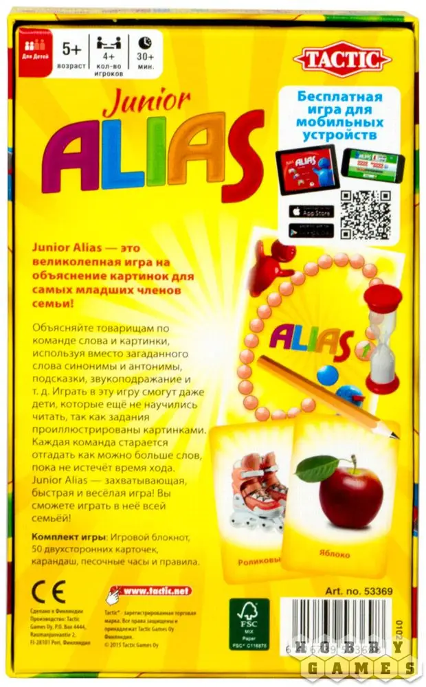 Перед нами адаптированная версия игры для самых маленьких. Основное отличие здесь в том, что слова на карточках не только написаны, но и изображены. Слов в наборе получается меньше, чем в классической версии, они проще и понятнее, но это позволяет расширять словарный запас нашим детям, а также развивать мышление.