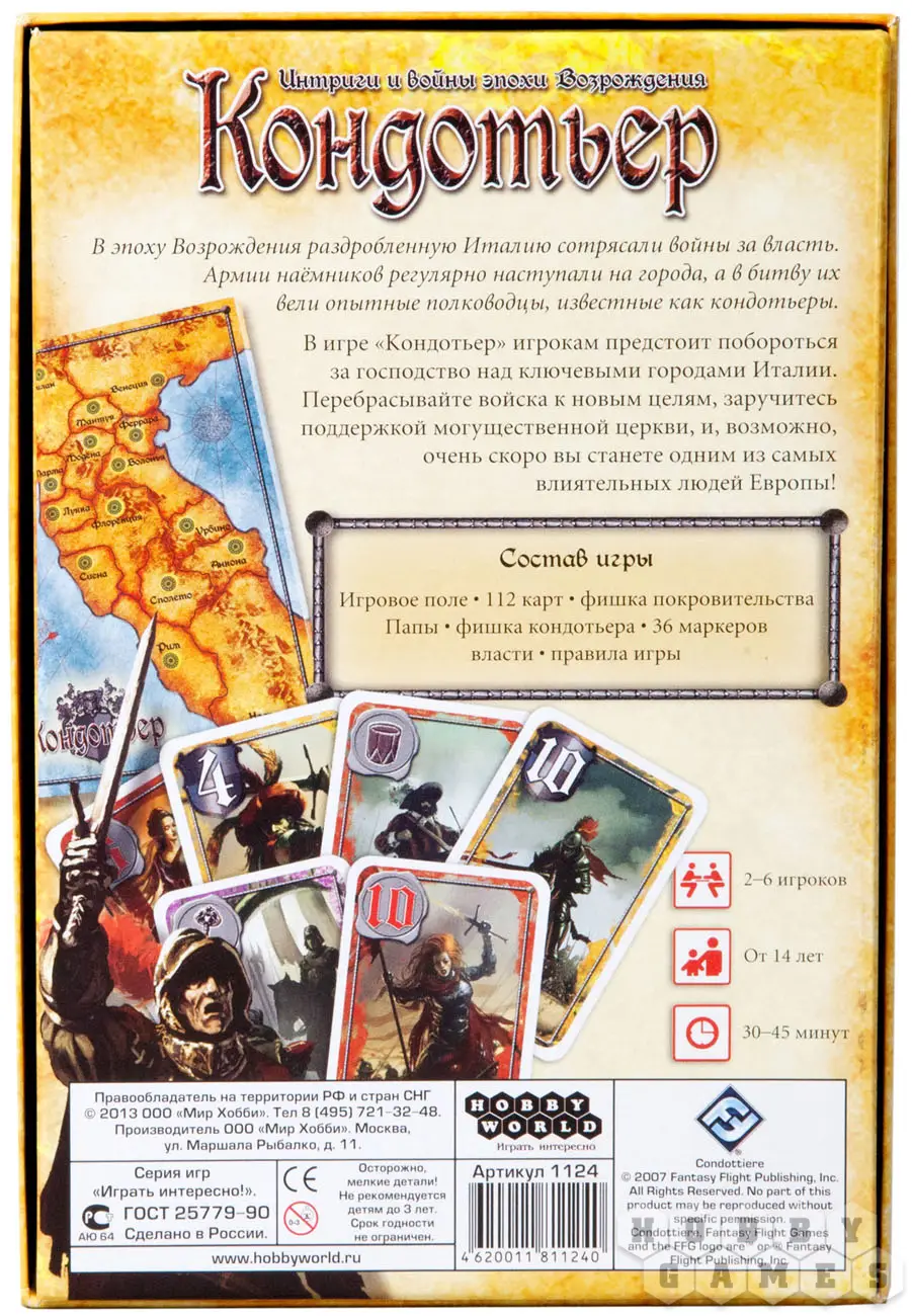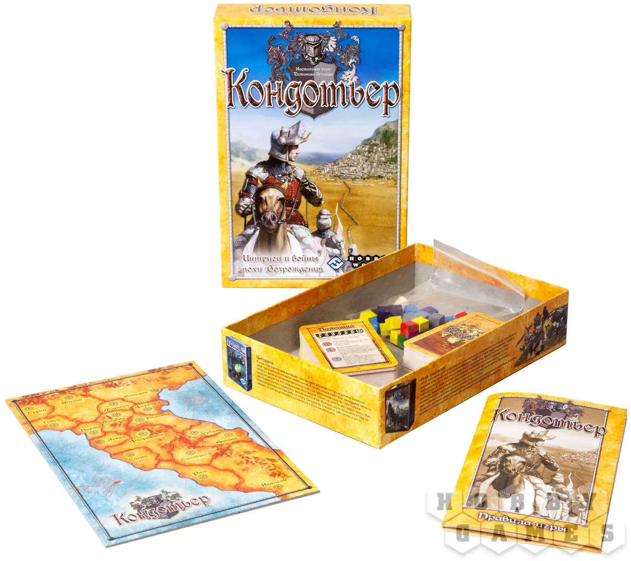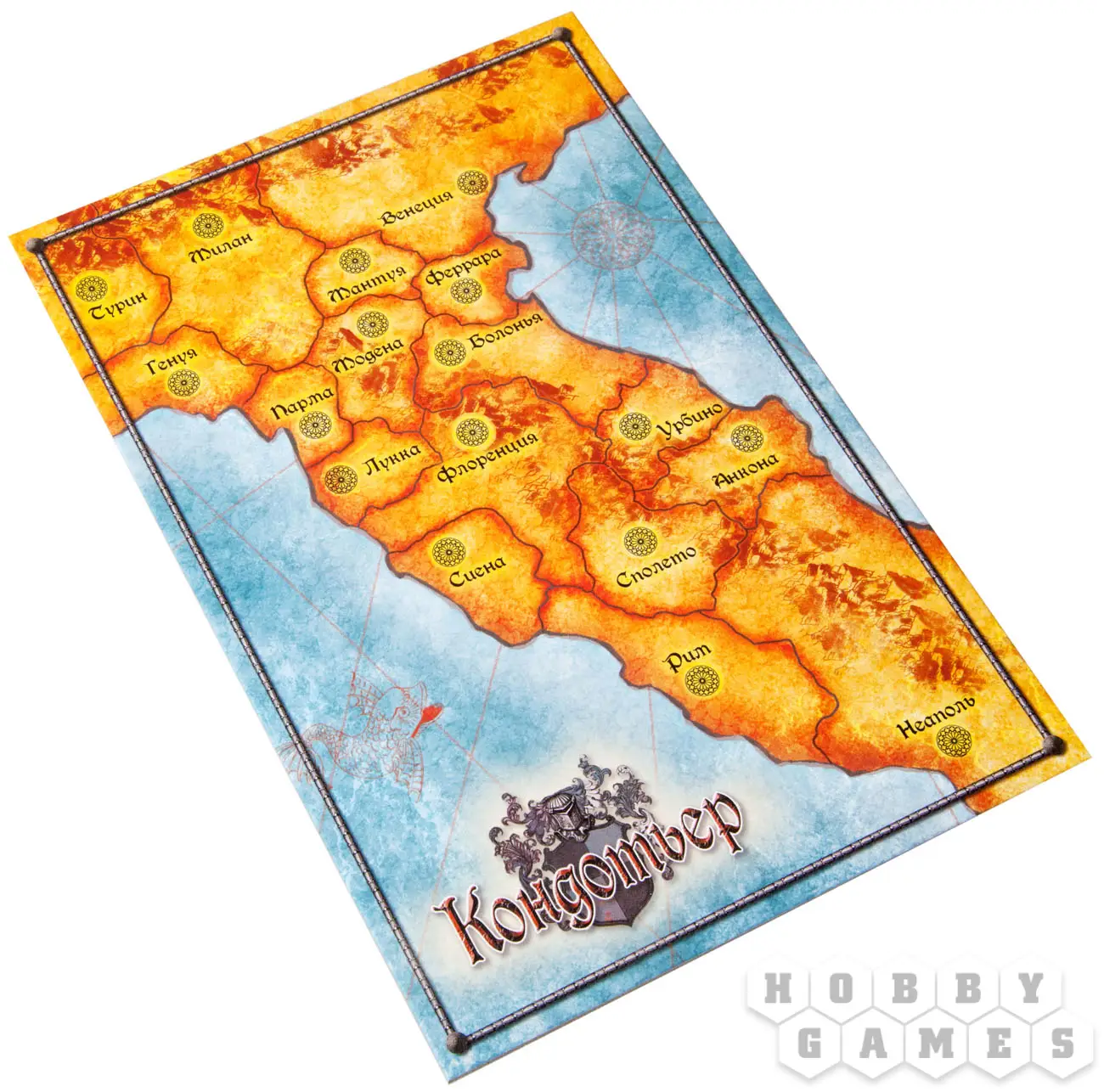 Возрождение принесло в Италию не только надежду, но и междоусобные войны. Кондотьеры, опытные полководцы, вели на штурм целые армии наемников. В настольной игре «Кондотьер» Вам предстоит захватить, а главное - удержать ключевые города Италии. Перемещайте войска, получайте благословление церкви, и становитесь одним из самых влиятельных людей эпохи!
