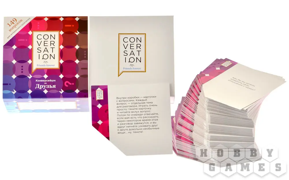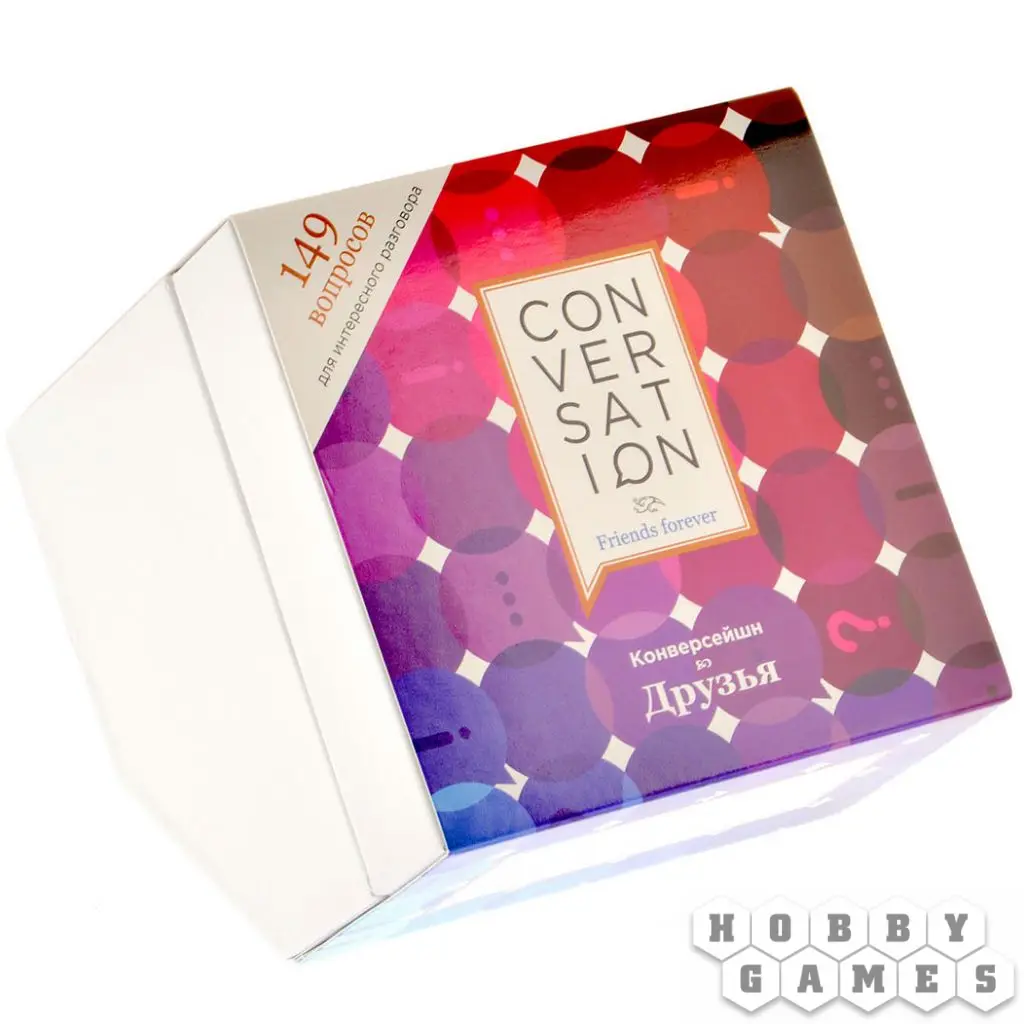 Серия игр “Конверсейшн” поможет Вам наладить диалог и узнать своих лучших друзей ещё лучше! Правила игры простые – тяните карточку и задавайте вопрос, а потом по очереди отвечайте на него.