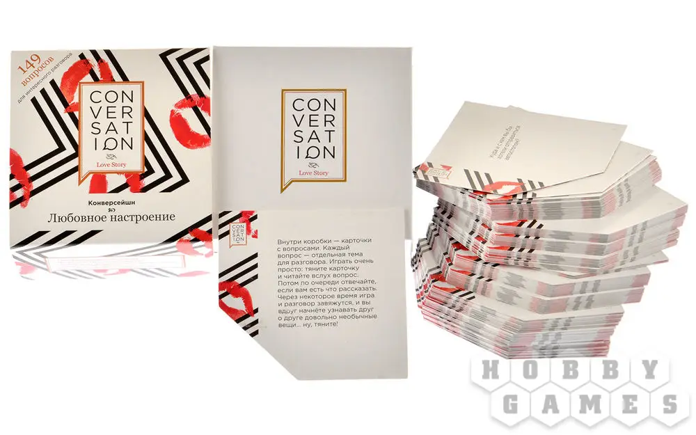 “Конверсейшн. Любовное настроение” – версия игры для влюблённых парочек. Здесь Вас ждут вопросы, которые помогут Вам определить, стоит ли Вам связать свою жизнь с ней или с ним. Например, “Что стоит между Вами и Вашим счастьем?”, “Скажете ли Вы правду, когда дети спросят о Вашем первом любовном опыте?”, или же “Способны ли Вы простить измену?”. Слушайте ответ и отвечайте сами, Вы сможете построить разговор и узнать всё то, что не спросить в обычном разговоре.