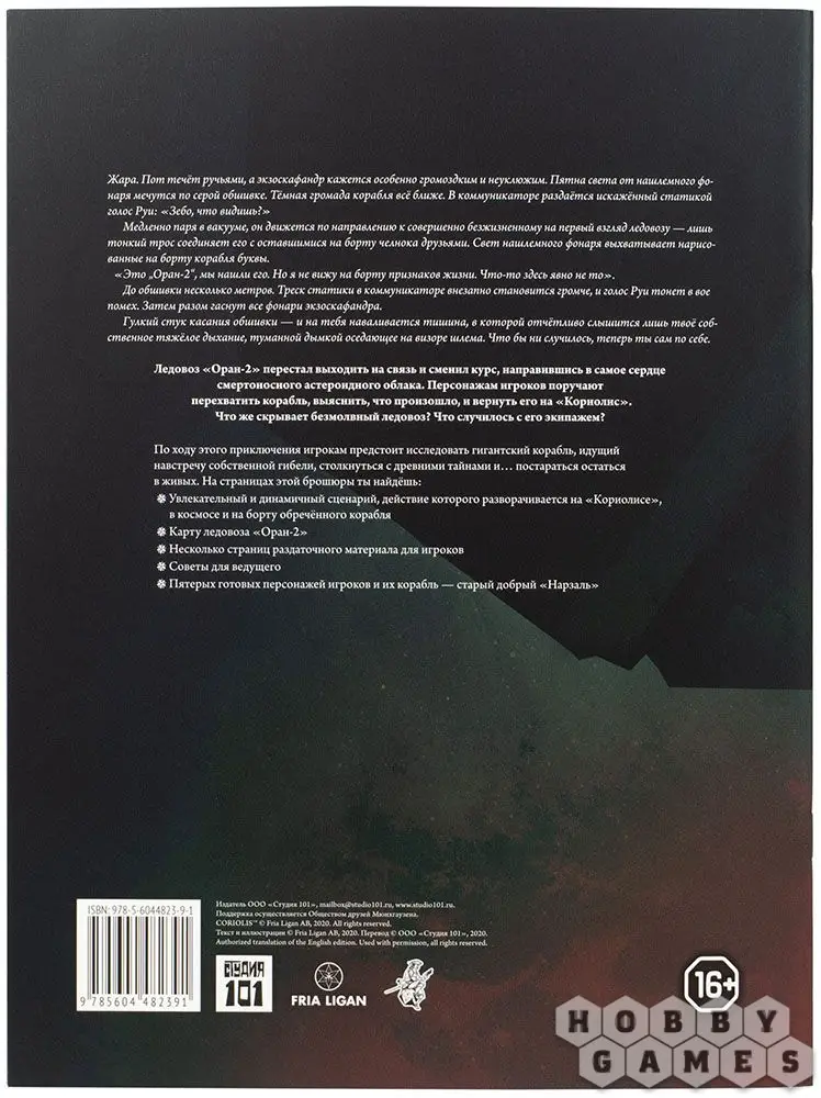Под обложкой издания вы найдёте не только сценарий и карту локации, но и пять готовых персонажей – дружный экипаж космолёта "Нарзаль", а также раздаточные материалы для игроков и советы для ведущего. Тайны "Орана-2" ждут вас!