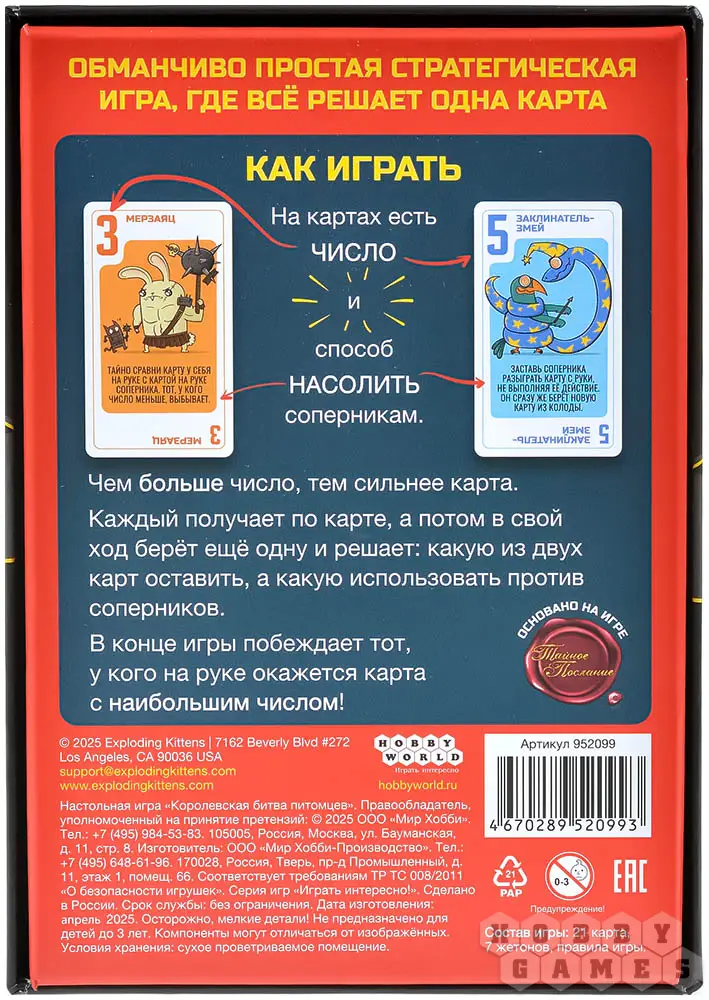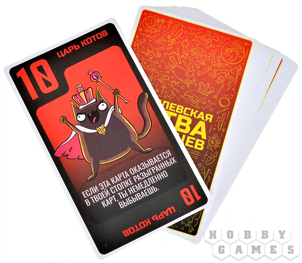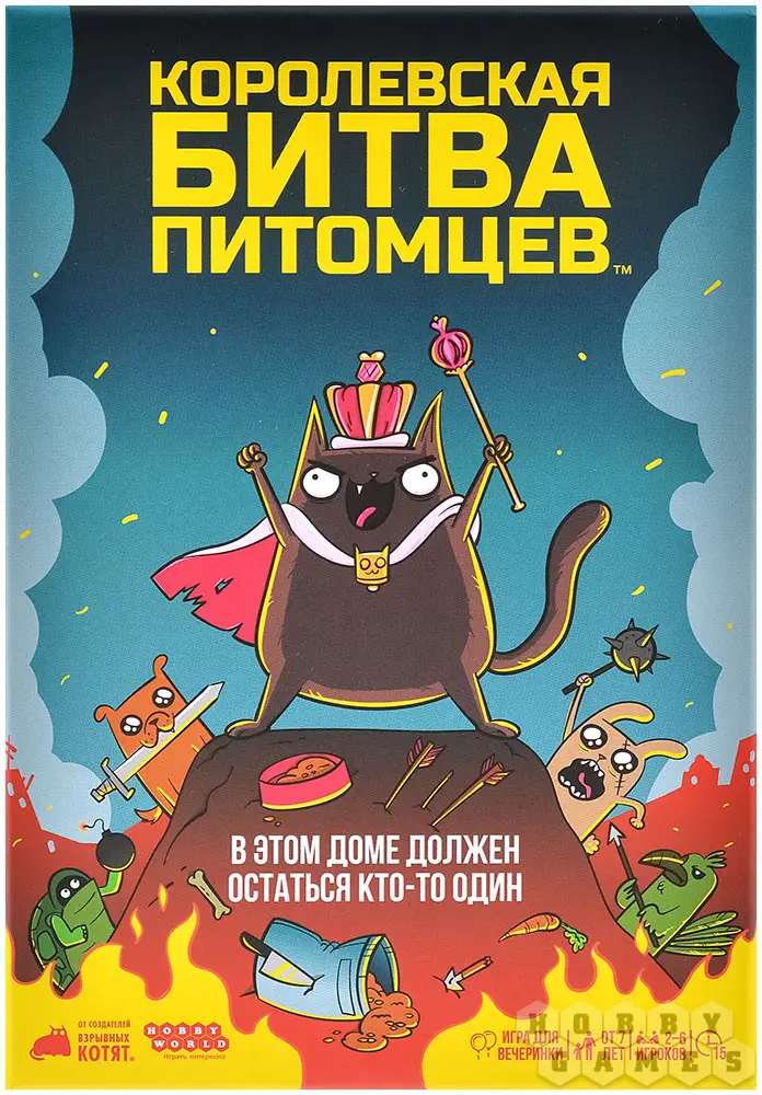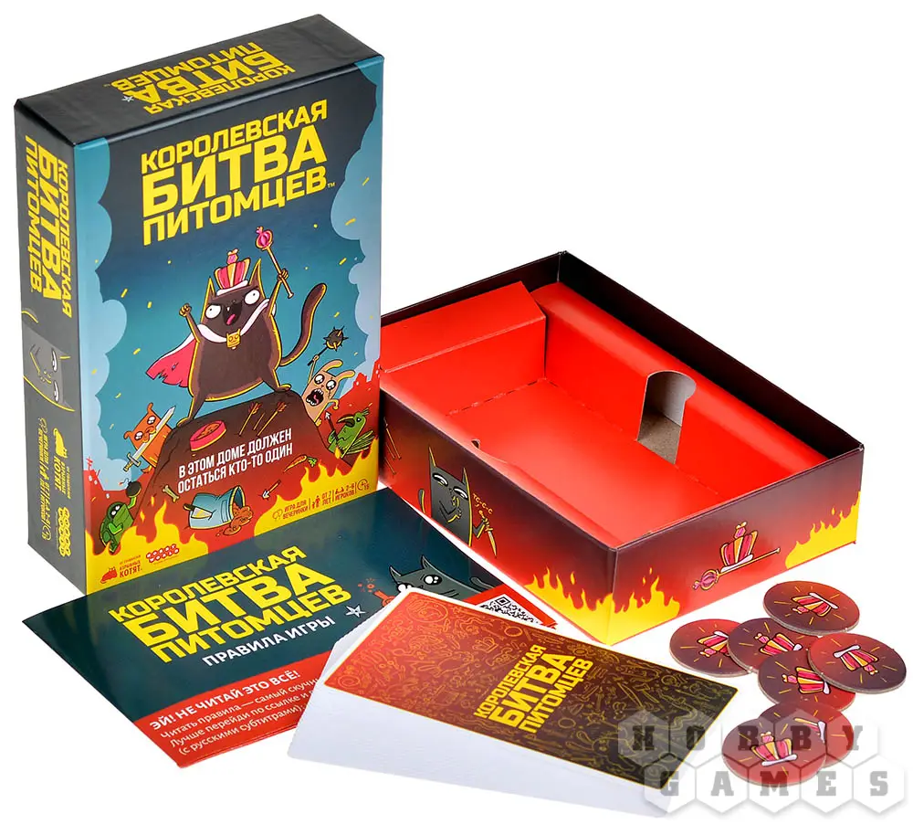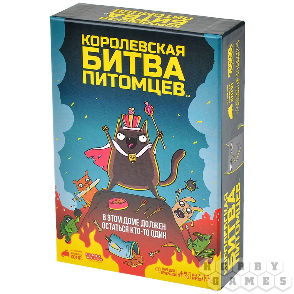 "Королевская битва питомцев" – это весёлая вечериночная игра от создателей знаменитых и любимых множеством "Взрывных котят". Здесь каждый раунд превращается в стремительное столкновение чисел и коварных способностей. Всё начинается с одной карты и одной же картой заканчивается – и лучше бы у неё было самое большое число среди всех собравшихся за столом! Ведь если бы хотите победить, не нужно быть гением: ваша карта просто должна побить все остальные. В чём сложность (и самое веселье)? В том, что лишние карты вы будете разыгрывать! Выбивать соперников из игры, красть карты, устраивать хаос на поле – или, наоборот, защищаться от нападок. Звучит легко, да? На словах-то всё понятно, вот только соперники тоже не дремлют и только и ждут, как бы устроить вам какую-нибудь карточную гадость...
