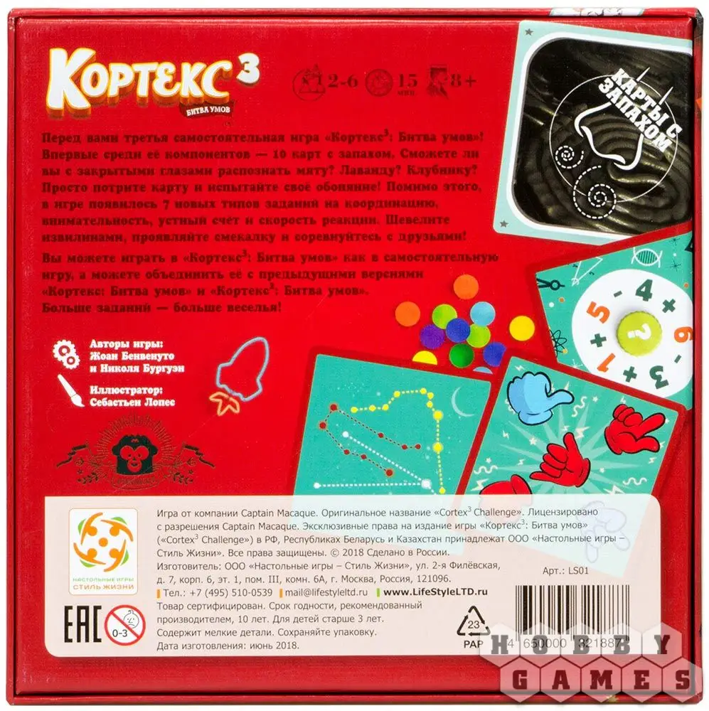 Перед Вами третья часть занимательной игры – "Кортекс 3. Битва умов"! Главной особенностью этой части являются 10 особенных карточек с различными запахами. Узнаете запах лаванды? А сможете быстро отличить его от мяты? И это не открывая глаз. Потрите карту и проверьте своё обоняние. Плюс к этому, в игру добавили 7 новых типов заданий. Устройте соревнование в кругу друзей, напрягите мозги и включайте смекалку на полную!