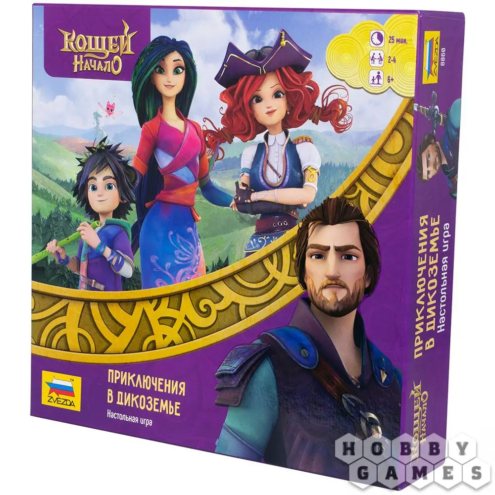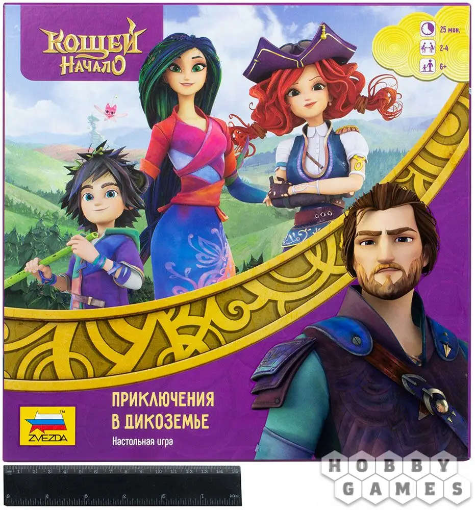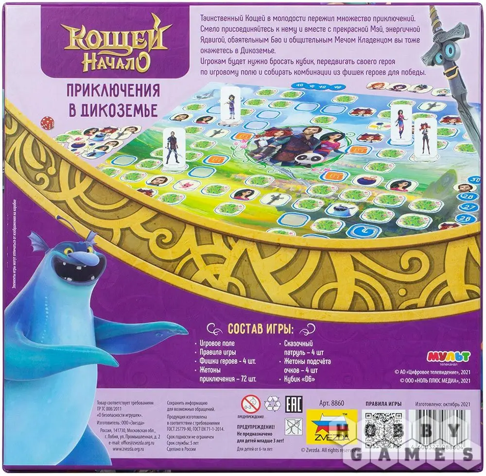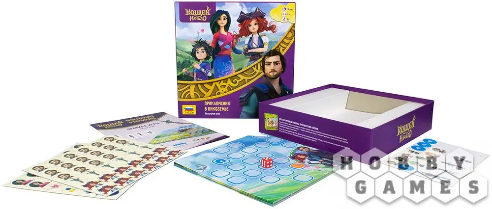 "Кощей. Начало. Приключения в Дикоземье" – это настольная игра по мотивам одноименного мультфильма, история которого повествует о молодом волшебнике Кощее и его приключениях. Игрокам предстоит взять на себя роль одного из персонажей мультфильма, объединиться с товарищами и победить злодеев в таинственных землях Дикоземья! Перемещайтесь по игровому полю броском кубика, собирайте фишки в целое комбинации и заработайте как можно больше победных очков!
