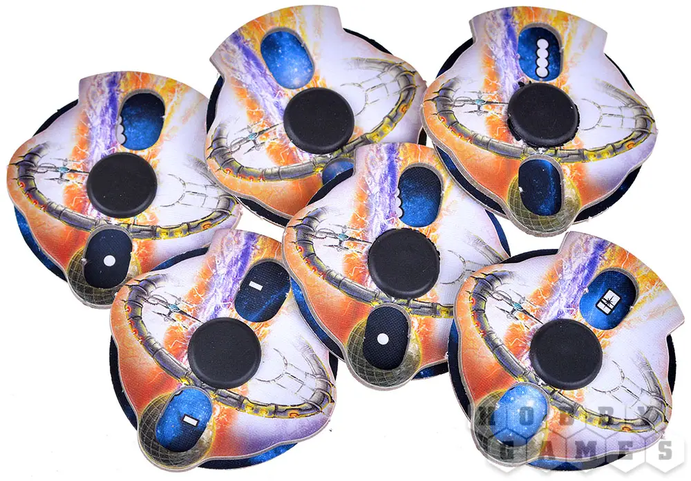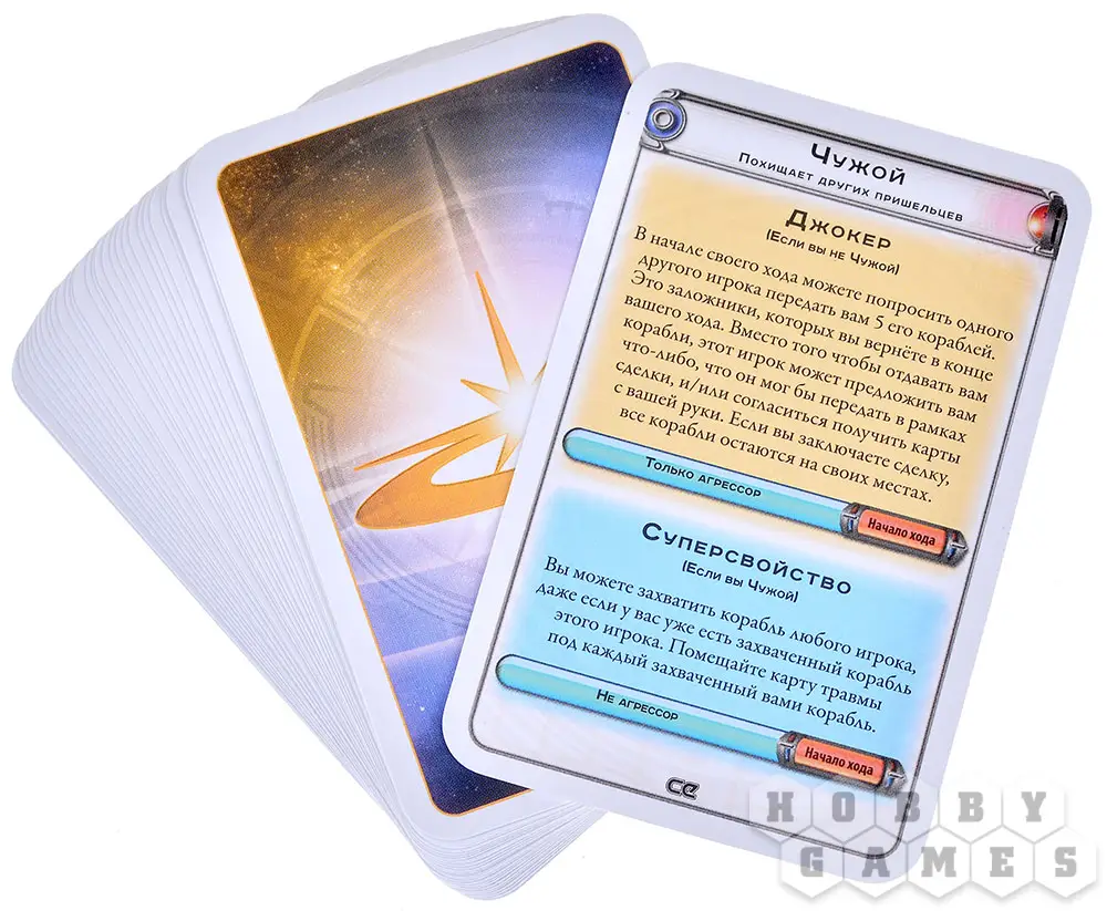 Затем из карт замешиваются колода судьбы и космическая колода. Посреди стола располагается Варп со шкалой для счётчиков далёких колоний. Теперь всё готово для начала первого хода: эта честь может быть отдана, например, самому молодому из участвующих игроков. Совершающий ход игрок именуется Агрессором.