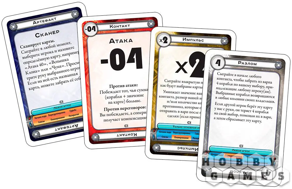 Теперь Агрессор и Защитник могут пригласить не участвующих в текущем контакте игроков к вступлению в союз с ними. В рамках хода допускается союз только с одной из сторон контакта, соответственно, определяющий дивиденды или "урон", в зависимости от исхода противостояния. После того, как все союзы заключены, участники контакта выбирают по одной карте с руки и взакрытую кладут перед собой: этими картами в следующую фазу раскрытия определяется исход противостояния. В зависимости от того, разыграны ли карты Атаки, Переговоров или Метаморфоз, и какие числовые значения эти карты имеют, определяется результат: победит ли Агрессор или Защитник, будет ли заключена успешная сделка, какую компенсацию смогут получить участники конфликта и их союзники.