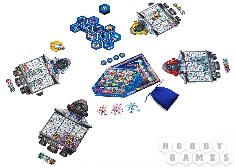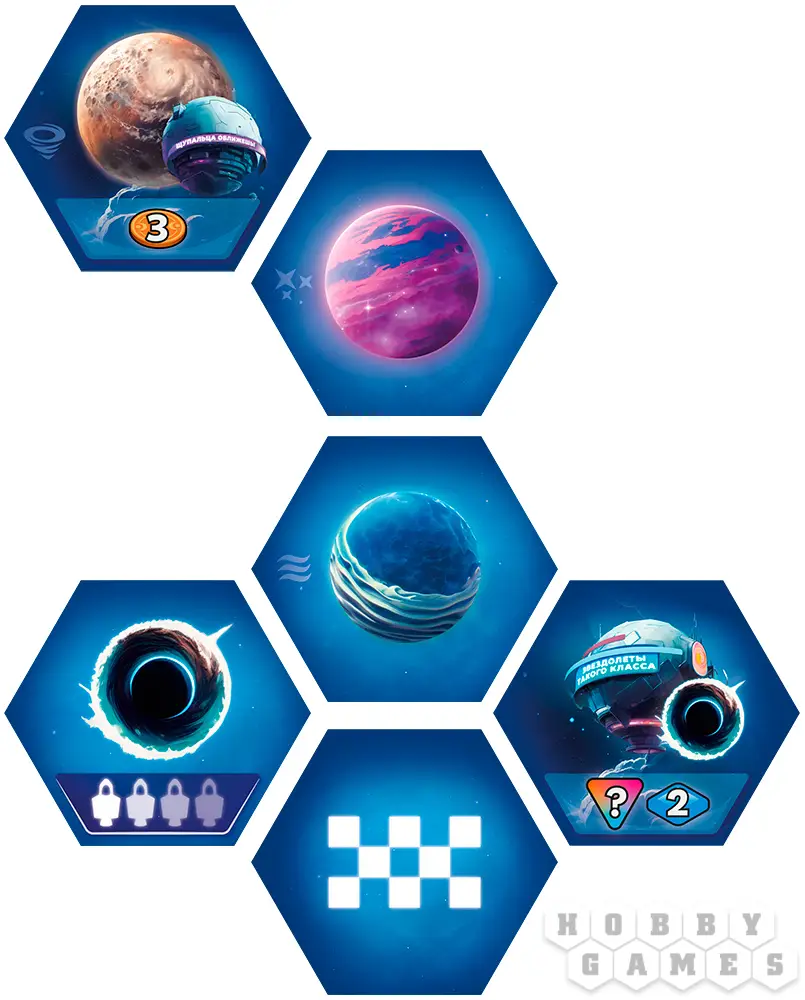 Соберите небольшую Вселенную из четырёх стартовых жетонов космоса. Рядом с ней поместите планшет бюро, двухсторонние жетоны кредитов и запас жетонов образцов. Возьмите жетоны агентов, поместите их в мешочек и вытяните оттуда случайные 3 штуки – они размещаются справа от трека бюро и образуют очередь агентов. Каждый игрок получает планшет своего космического корабля фишки топлива и корабля, 5 жетонов офиса и 3 стартовых торговых агента. Дальнейшие нюансы подготовки мы опустим и перейдём к сути.