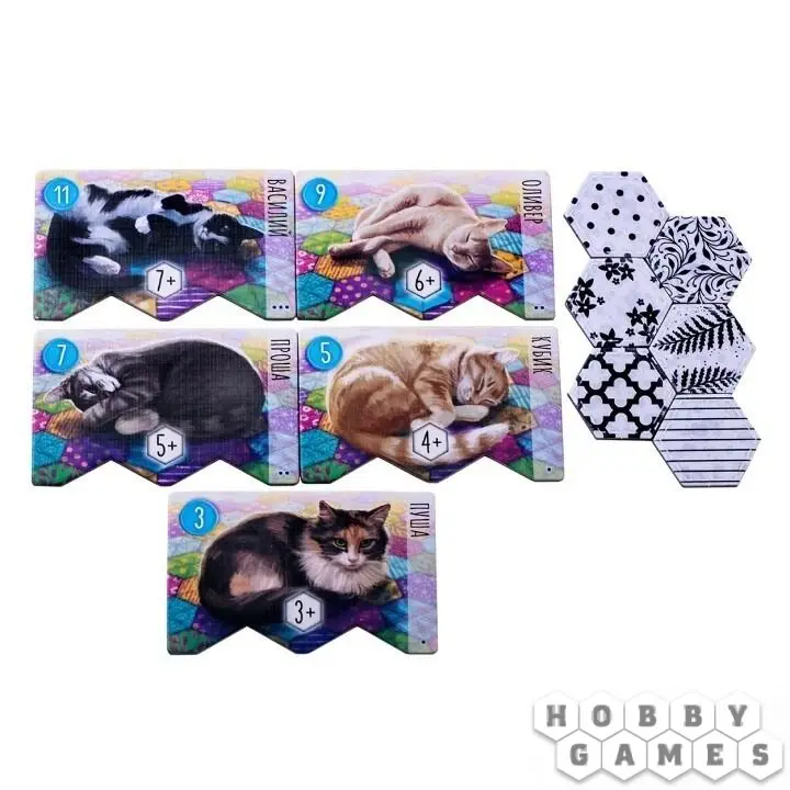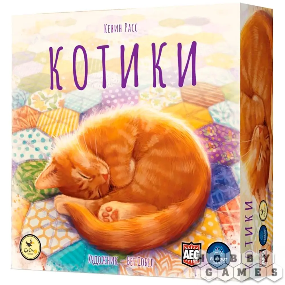 "Котики" – это простая настольная игра-головоломка для одного или небольшой компании из 4-х человек. Задача игроков – сшить одеяло для новых питомцев, размещая разноцветные лоскутки-жетоны как можно продуманнее, чтобы заработать больше победных очков. "Шитьё" происходит на картонных планшетах, на которых игроки выкладывают разноцветные жетоны. Если котика устраивает сочетание цветов и пуговиц, то вы получаете победные баллы. Игрокам необходимо, чтобы готовое покрывало получилось похоже на то, что изображено на эскизе. Важным элементом является декорирование покрывала пуговицами-фруктами, пуговицами-радугой и другими. Они помогут привлечь к одеялу всех котиков, проходящих мимо. В правилах игры вы сможете познакомиться с питомцами поближе, ведь у каждого из них есть своё имя и своя история одной из девяти жизней. Подарите милым питомцам уютное место для безделья и мурлыканья, и за это вы получите значок "Лучшего портного"!