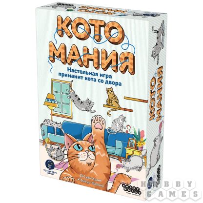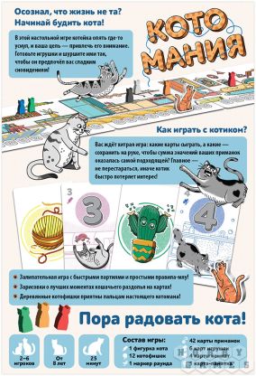 "Котомания" – настольная игра на расчёт и умение вовремя остановиться. В каждом раунде игроки стараются приманить кота с помощью карт приманок, выкладывая их под разные игрушки и наращивая их привлекательность. Важно не просто собрать побольше очков, а точно рассчитать усилия, ведь победит тот, кто окажется ближе всего к коту. Игра длится несколько раундов, постепенно усложняется за счёт асимметрии в картах на руке и отлично подходит для семейных вечеров и компаний друзей!