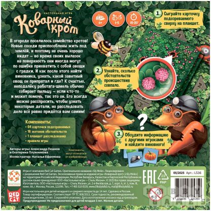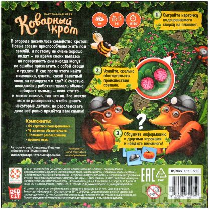 "Коварный крот" – это настольная игра для самых проницательных садоводов! Вам предстоит расследовать загадочные пропажи овощей с грядок. Ваша цель – вычислить, какой именно овощ он припрятал в этот раз. И в какой из своих многочисленных норок его спрятал! Главной особенностью игры является детективный геймплей, построенный на дедукции и внимании. Яркое игровое поле и очаровательные компоненты создают тёплую и уютную атмосферу, которая понравится и детям, и взрослым. Это идеальный способ весело и с пользой провести время в кругу семьи или друзей, развивая логическое мышление.
