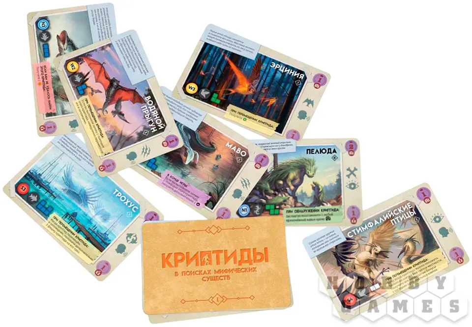 Игра сочетает в себе элементы стратегии, планирования и долю везения. Каждая партия предлагает разнообразные механики: от управления ресурсами (деньги, опыт, слухи) до тактического размещения тайлов в заповеднике. Вас ждут красочные иллюстрации, несколько уровней сложности карточек криптидов и возможность развивать навыки вашего учёного. Уникальные дополнительные режимы добавляют игре глубины и многогранности, делая каждую партию неповторимой.