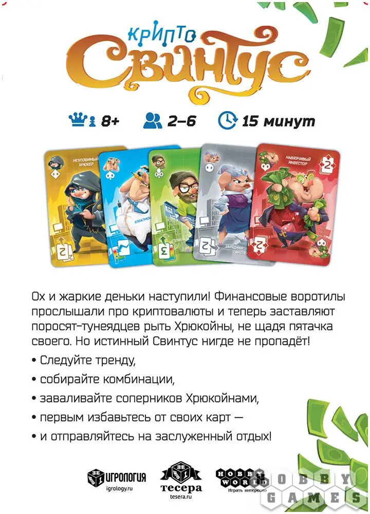 Каждый, кто ищет лёгких путей заработать, слышал краем уха про криптовалюты, биткоины и прочие блокчейны. Сразу нашлись профессионалы, которые готовы сунуть свой пяточек в любое более или менее прибыльное начинание. И всё завертелось... Воротилы бизнеса вложились как следует, и теперь поросята рангом пониже днем и ночью роют сотни Хрюнкоинов. Свинтусы накинулись на халяву! Их тысячи, но прибыль получат только единицы... Чтобы оказаться в числе победителей, изучайте биржевые тренды, собирайте комбинации и топите соперников отборными Хрюнкоинами, чтобы первым "выйти в кэш"!