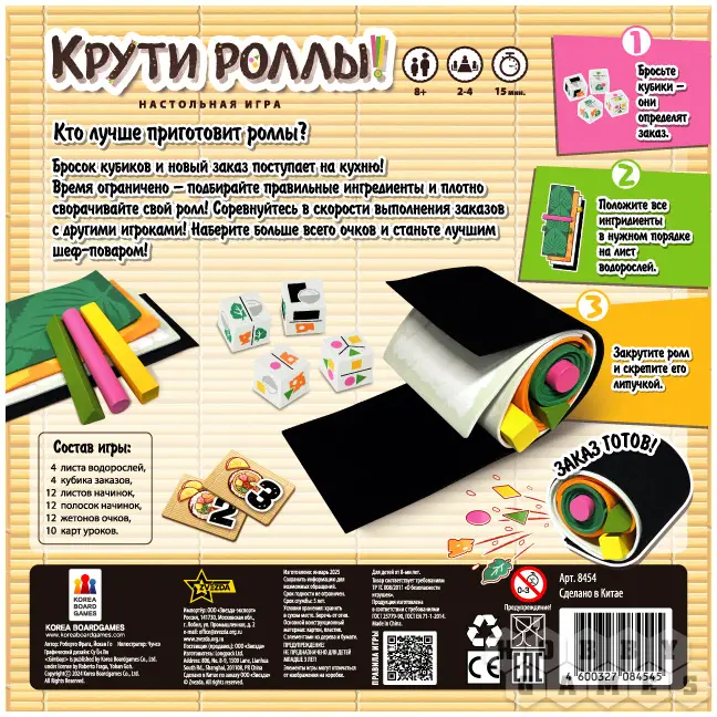 "Крути роллы" – это динамичная настольная игра на скорость, реакцию и внимательность, в которой участники превращаются в поваров корейской кухни. С помощью бросков кубиков определяются заказы, а игроки должны оперативно подобрать нужные ингредиенты и свернуть идеальный кимбап. Каждый ход – это новый вызов: вам нужно быстро собирать компоненты, следить за правильной последовательностью и аккуратно заворачивать роллы. Побеждает тот, кто наберёт больше очков, создавая самые точные и быстрые заказы. Проверьте свою ловкость и станьте шефом лучшей кимбап-ресторации!