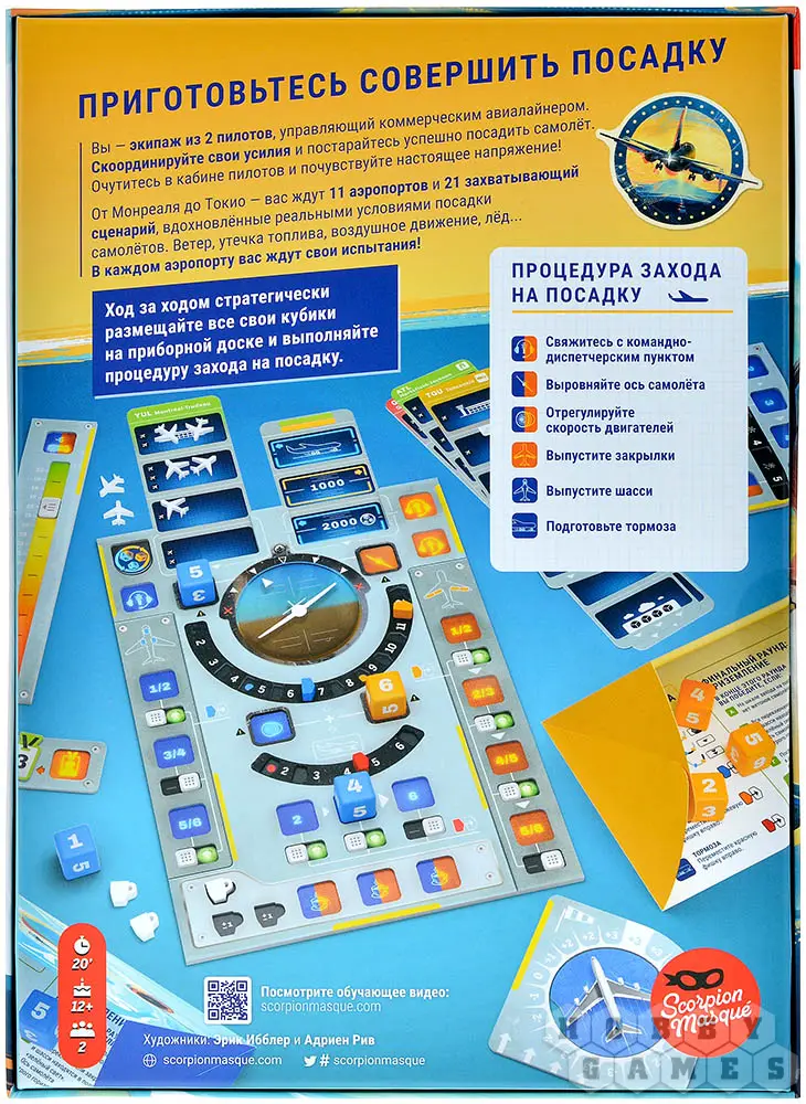 В этой увлекательной игре вы станете экипажем из двух пилотов. Пошагово размещайте кубики на приборной панели, чтобы подготовить свой самолёт к приземлению. Обращайте внимание на скорость, выравнивайте самолёт, общайтесь с диспетчерами, чтобы случайно не столкнуться со встречными самолётами, используйте закрылки, выпускайте шасси и, конечно же, не забывайте про тормоза. Как и в жизни, вы с товарищем сможете обсудить запланированные действия перед началом полёта, однако во время пути вы вынуждены будете молчать, полагаясь на взаимопонимание. Слаженная работа, хладнокровие и умение работать в команде станут вашими главными инструментами для достижения цели.