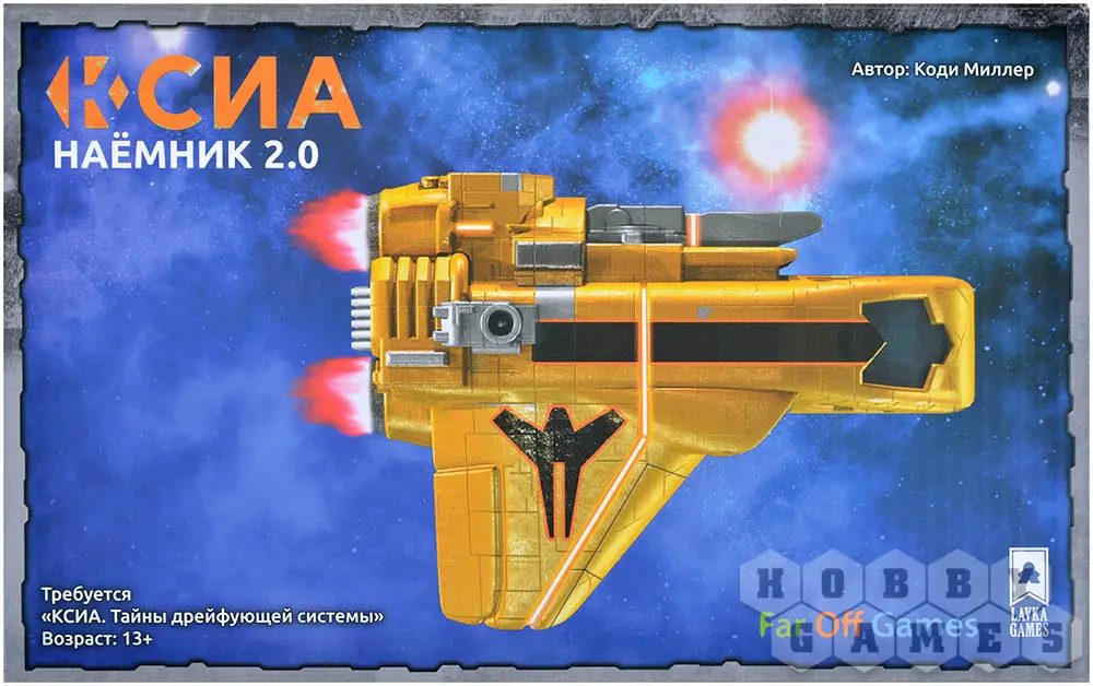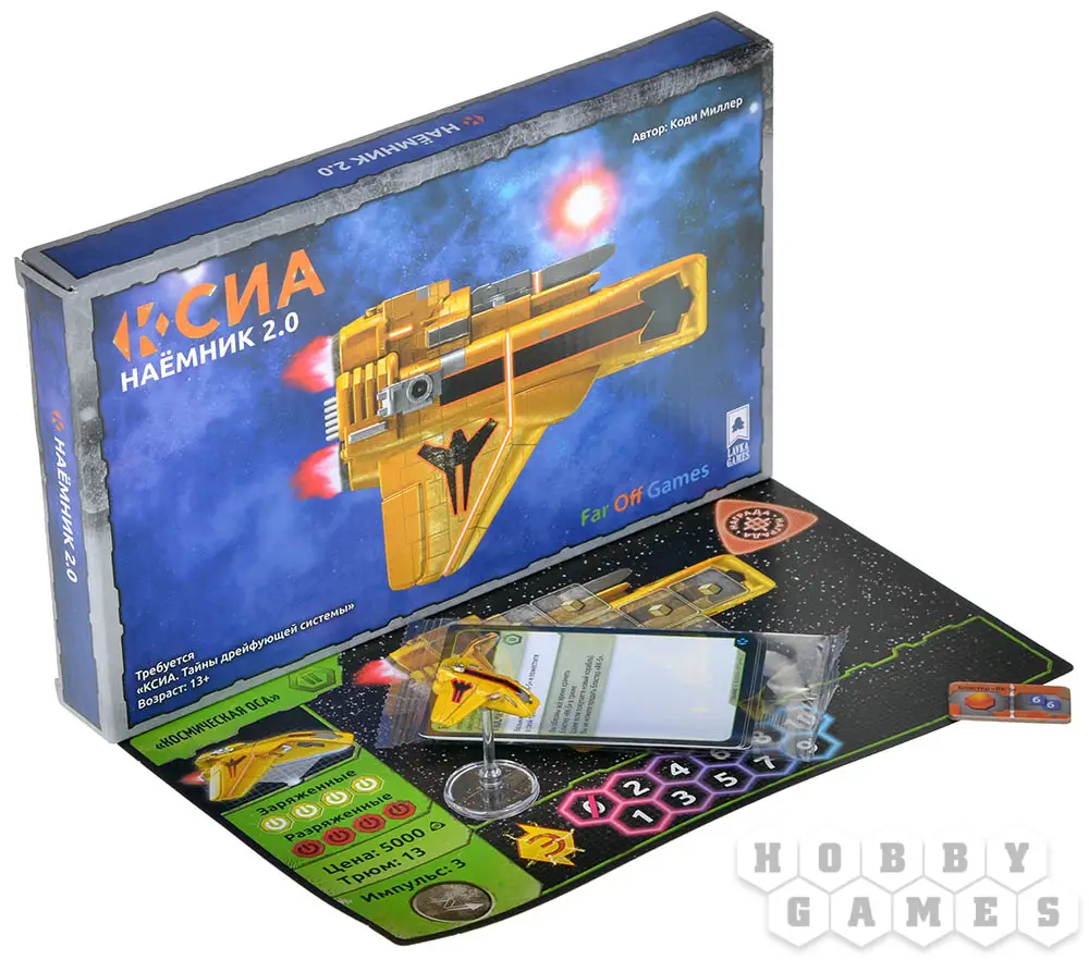 "Ксиа: Наёмник 2.0" – это дополнение, в котором вы сможете нанять ещё корабль под своё управление. В игре он только один, поэтому каждый игрок может взять его под контроль. Наёмник может совершать ходы только в свою очередь, а уничтоженные им корабли не приносят контролирующему его игроку ни славу, ни кредитов. Но зато он на вашей стороне, а огневая мощь никогда не бывает лишней. Однако помните: есть наёмник будет уничтожен, вы потеряете его карту, и он снова будет доступен для вербовки любому игроку.