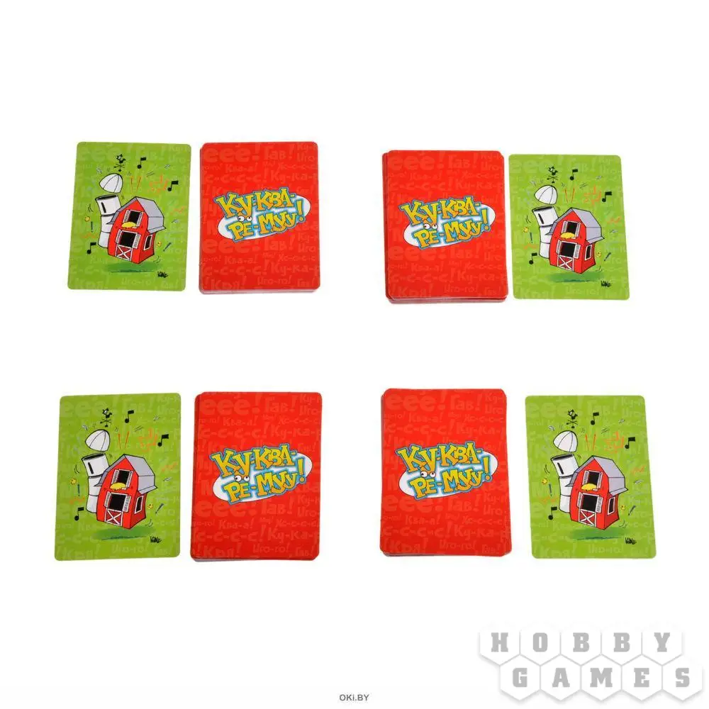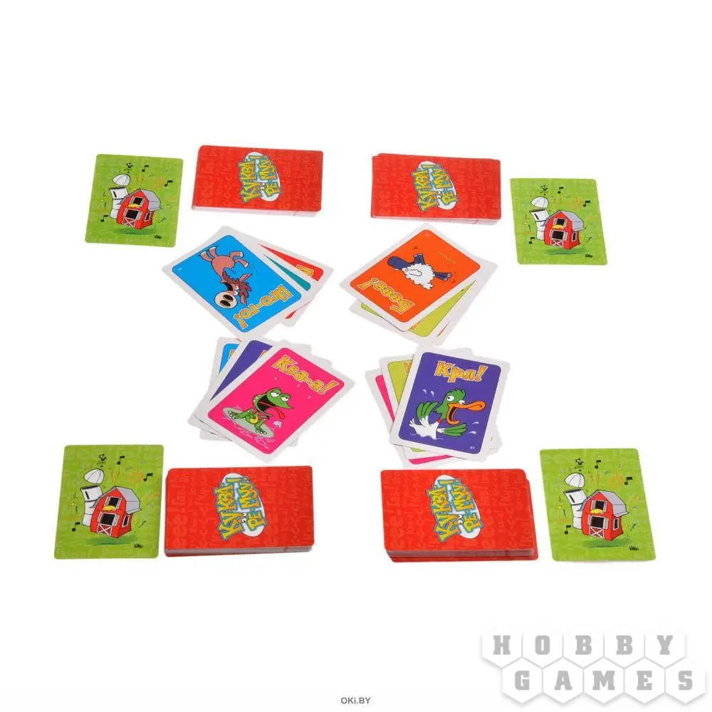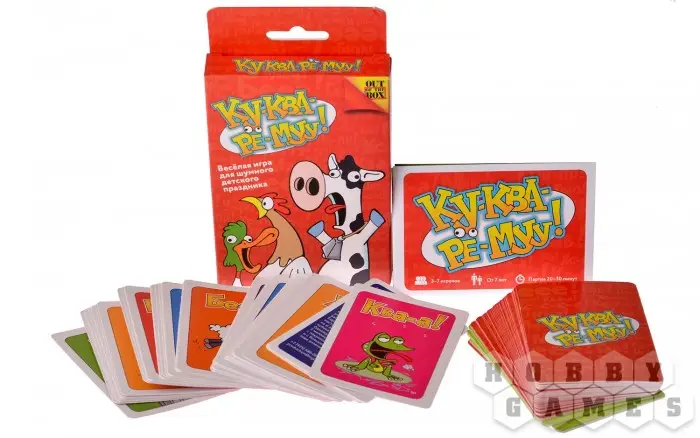 Перед вами настольная игра “ Ку-ква-ре-му”, которая понравится детям от 7 лет. Игрокам необходимо по очереди выкладывать карточки на стол. Если у двух игроков возникло совпадение, они имитируют звук, который издает изображенное животное. Тот, кто сделает это неправильно или медленнее другого, вынужден забрать себе обе карточки. Цель игры: быстрее остальных избавиться от всех карт в своей руке.