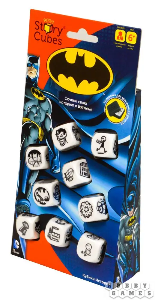 Игра для поклонников Бэтмена и супер-героев. Сочини свою историю о Бэтмене, например, начав с фразы "На темных улицах Готэма...". Сюжет полностью зависит от тебя, ведь только автор рассказа решит не планирует ли Загадочник очередное преступление или кто узнал личность Бэтмена? А может, история будет зависеть от того, выберется ли Джокер из лечебницы Аркхэм? С Кубиками Историй: Бэтмен, все решаешь ты. Бросай Кубики Историй и сочиняй множество рассказов о супер-злодеях, их коварных ловушках и о новых подвигах любимых героев.