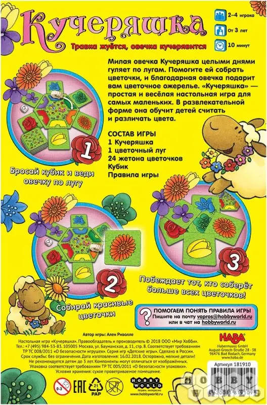 Игроки по очереди кидают кубик и передвигают фигурку Кучеряшки по часовой стрелке. Если выпадают одна, две или три точки, то фигурка передвигается на 1, 2, 3 деления, если же на кубике выпадает Кучеряшка, то игрок может передвинуть её на любой сектор по своему выбору. Если напротив зоны, куда попала Кучеряшка, лежат жетоны цветов, они достаются игроку – всё, это ваша заслуженная награда!