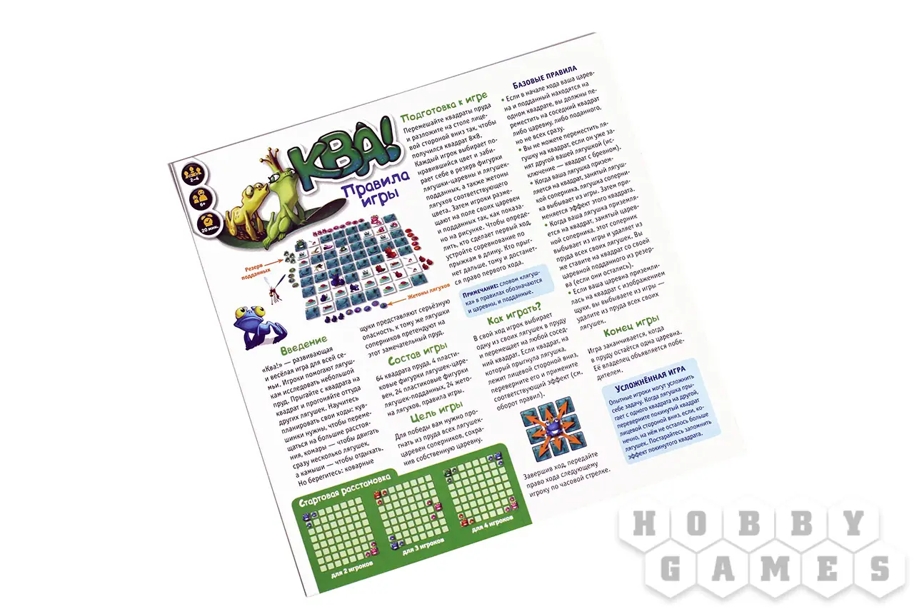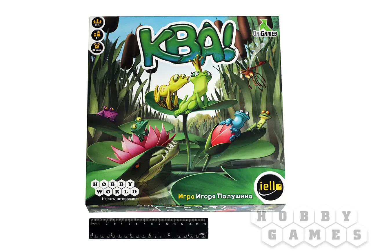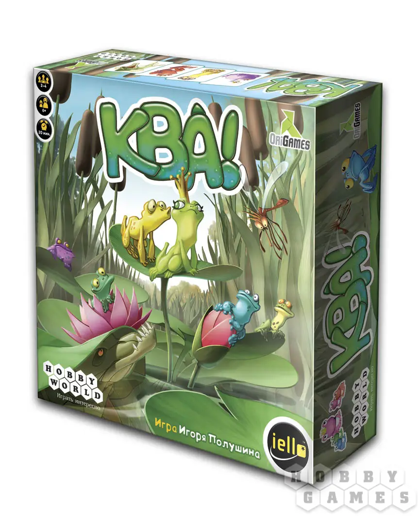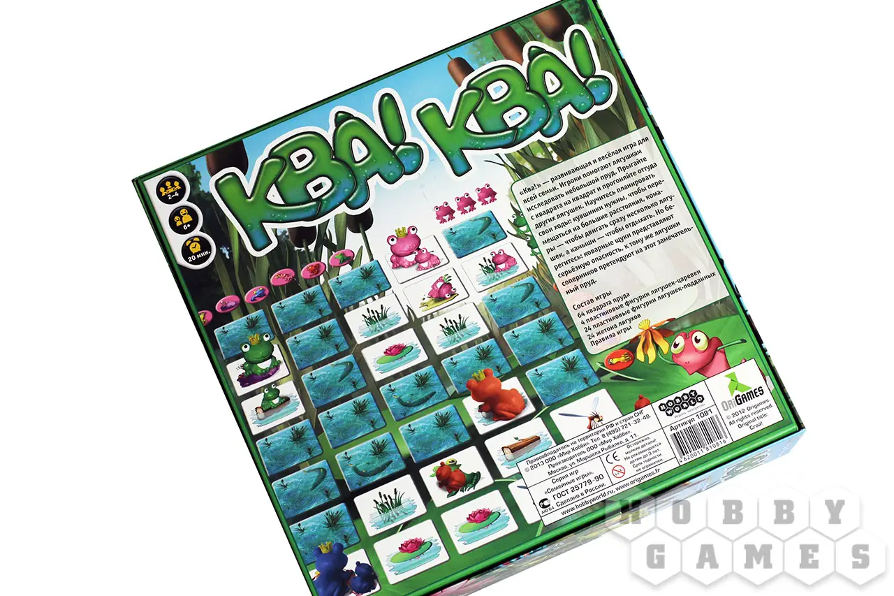 Настольная игра «Ква!» - это развивающая весёлая игра для всей семьи. Игрокам предстоит помочь милым лягушкам исследовать небольшой пруд. Но, так как он слишком маленький, а претендентов на пруд много, то борьба разразится нешуточная! Лягушки будут прыгать по клеткам и прогонять с них своих соперников. Вам же придётся продумывать каждый свой ход, ведь на поле есть различные объекты: кувшинки пригодятся, когда нужно переместиться подальше, комарики – чтобы передвинуть сразу несколько лягушат, а камыши – чтобы перевести дух и отдохнуть! Но не теряйте бдительности - щуки очень коварны и представляют большую угрозу для любого лягушонка!