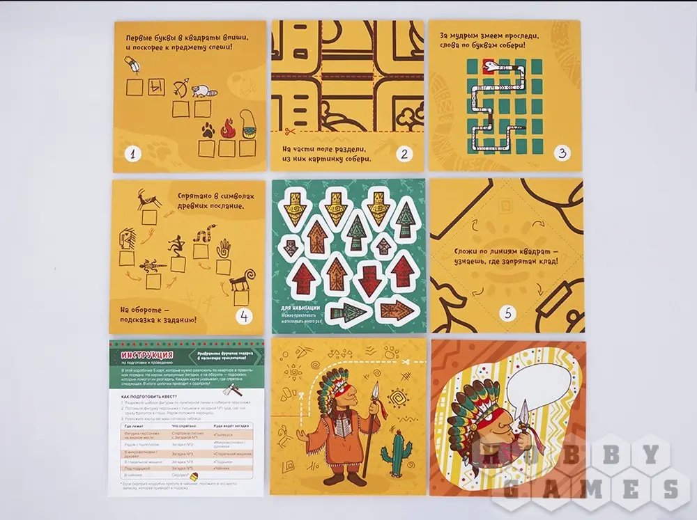 Внутри 5 ярких бумажных карт с загадками, которые вам предстоит разгадать, чтобы найти подарок: сложить карточку особенным способом, собрать пазл, пройти путь змея, разгадать слова с помощью древних символов или рисунков-подсказок. Квест — это цепочка заданий, которые следуют друг за другом. Он создает захватывающий сценарий детского праздника и увлекает всех: и взрослых, и детей. А организация займет у вас всего 15 минут!