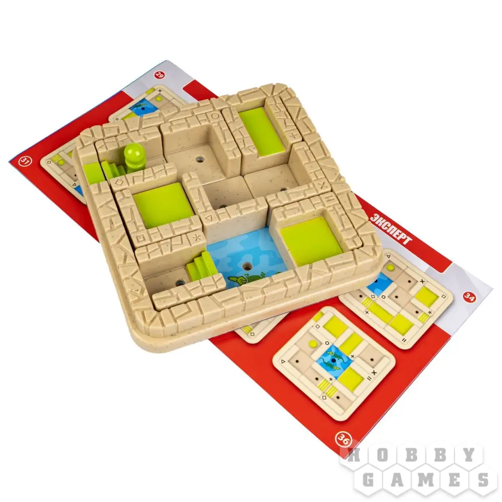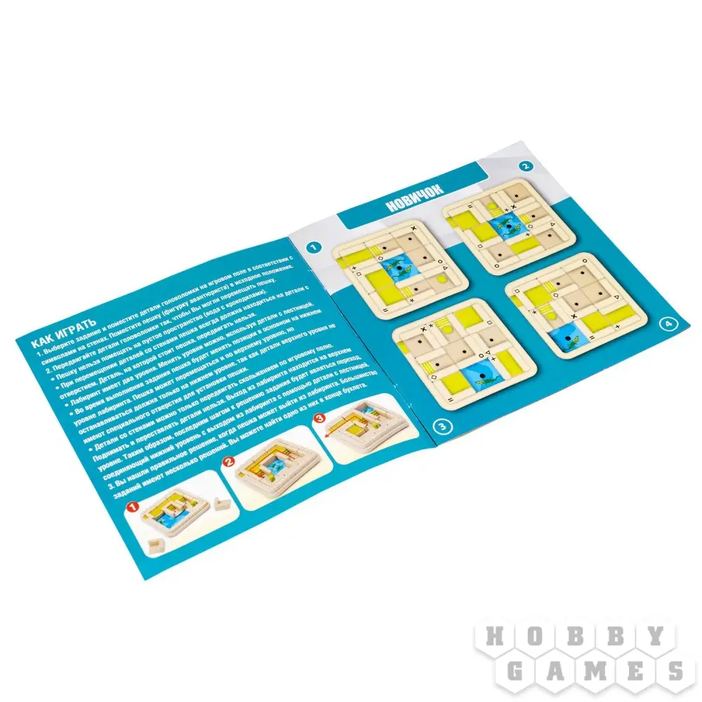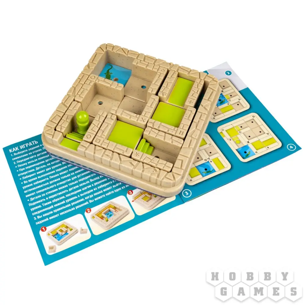 Выберите одно из заданий и разместите детали головоломки на поле согласно стартовой позиции. После этого вам нужно передвигать элементы таким образом, чтобы образовался проход для вашей игровой пешки (персонажа). У лабиринта есть верхний и нижний уровни, которые меняются друг с другом при помощи деталей с лестницей. Учтите, что стены передвигаются исключительно скольжением, поднимать их нельзя!