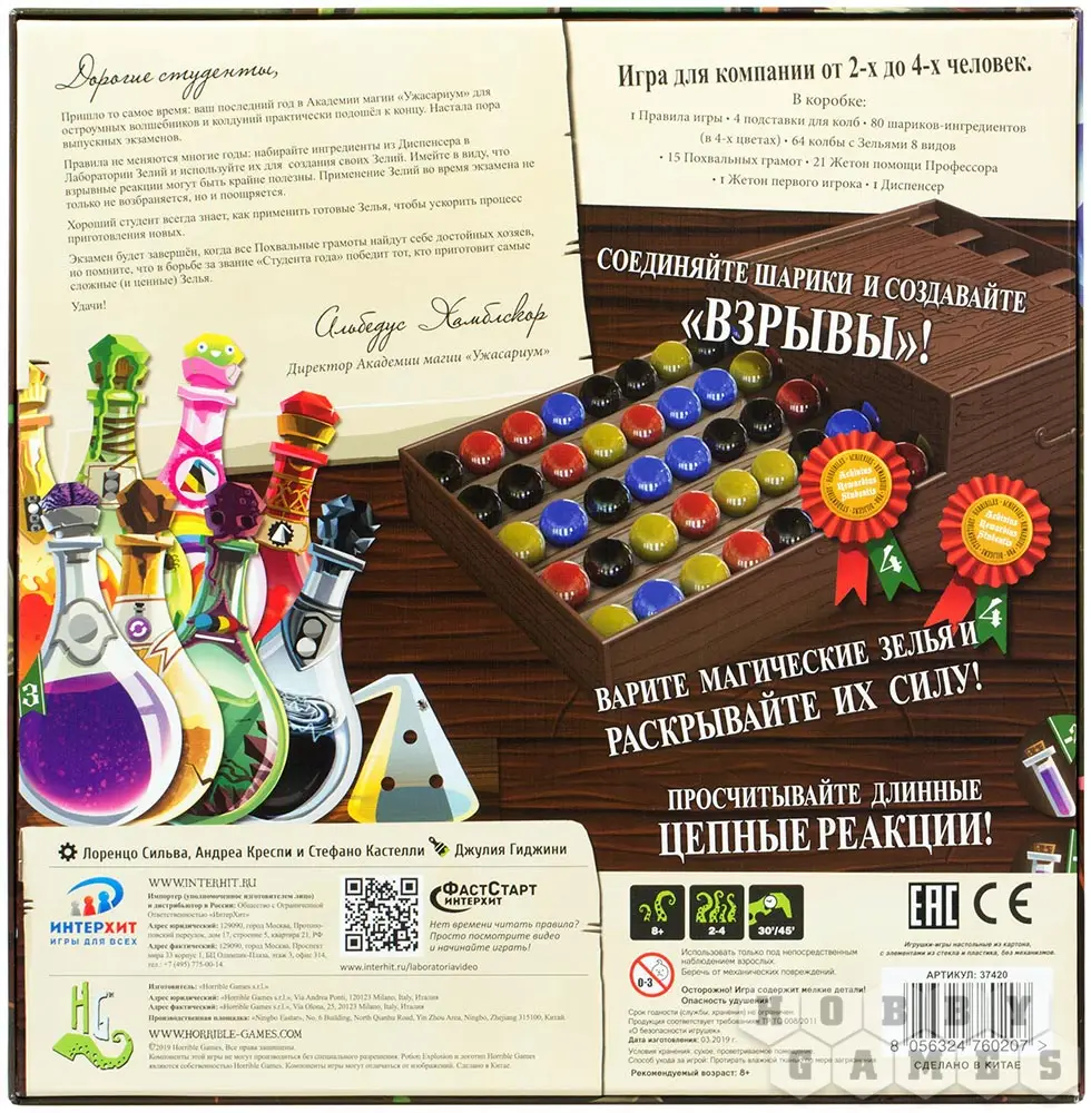 Каждый рецепт зелья требует несколько компонентов и приносит определённое количество очков. Собирая комбинации зелий, вы будете получать дополнительные очки.