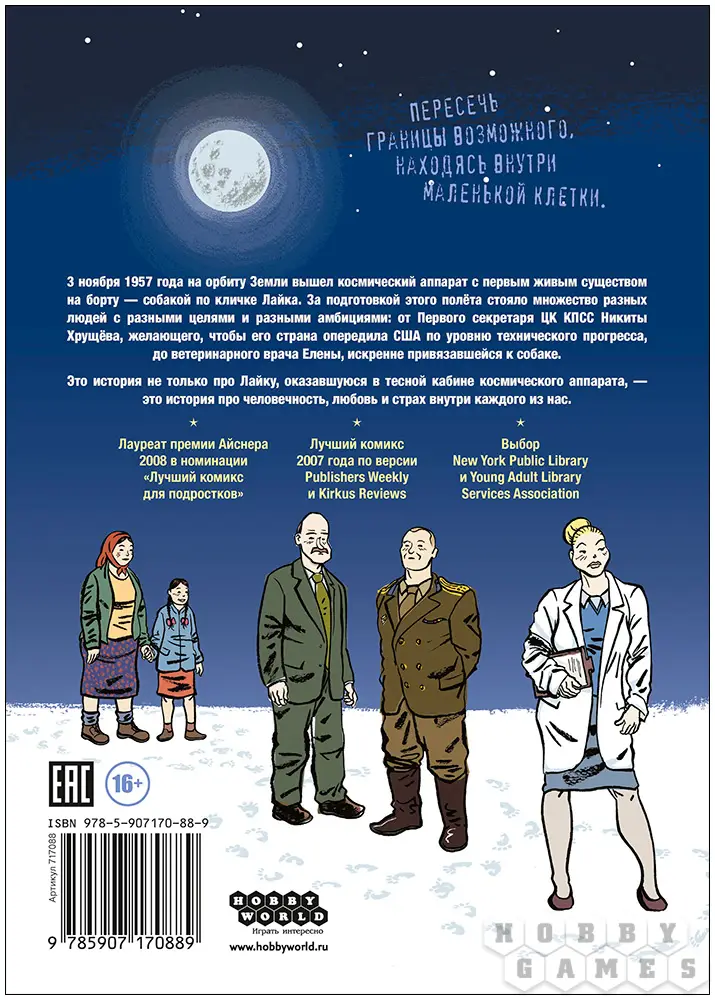 Лайка – первое живое существо, что оказалось на космической орбите Земли. Маленькая дворняжка, заброшенная для эксперимента в космос, не должна была вернуться, такой возможности конструкторы не предусматривали. В этой истории причудливо переплетаются жизни нескольких человек, связанных между собой полётом Лайки: гениального конструктора Королёва, Хрущёва, стремящегося опередить США в развитии космической программы, ветеринара Елены, что отвечает за здоровье испытуемой собаки... За историей обречённого животного Ник Абадзис находит историю о скрытой глубоко внутри человечности.